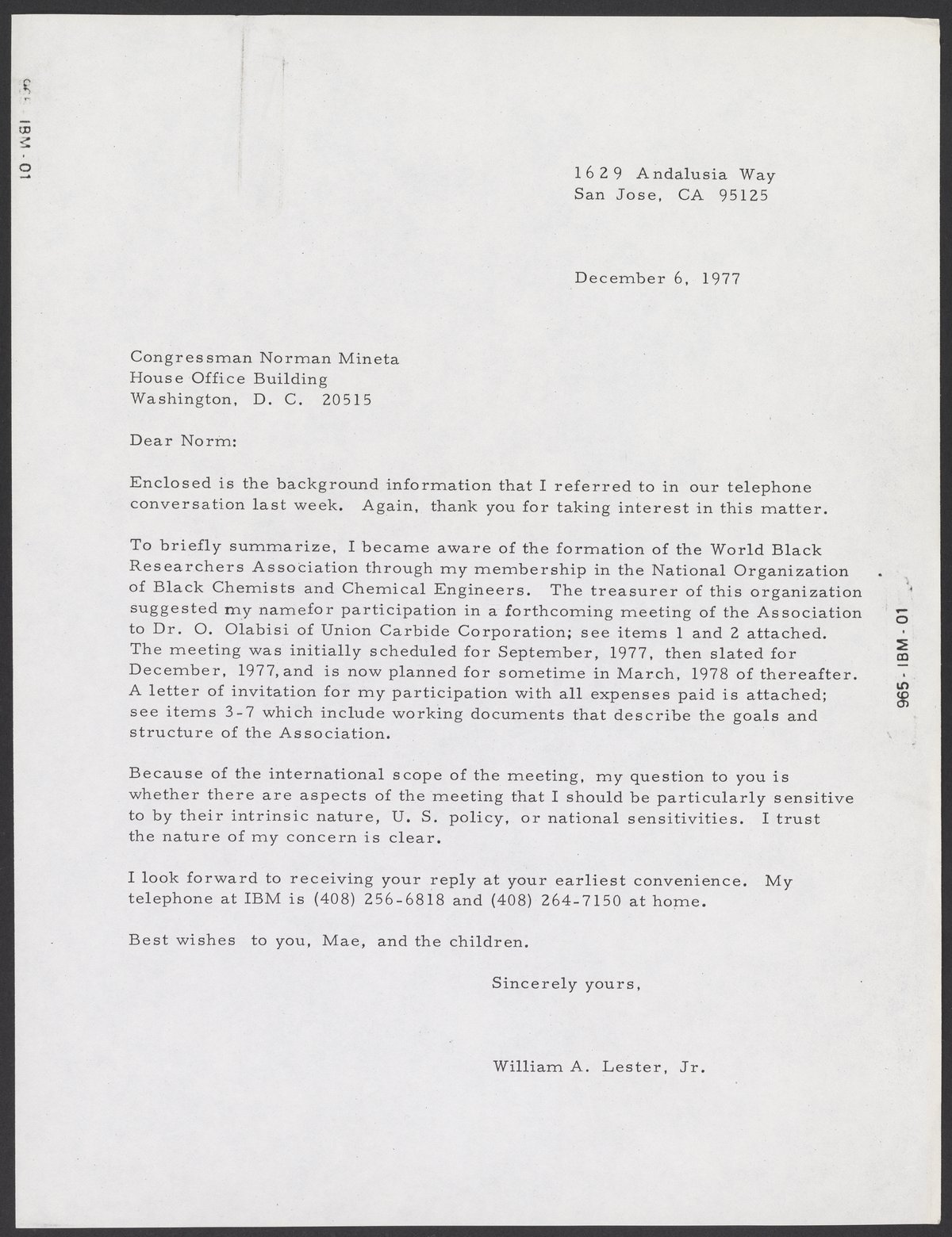 Letter from William A. Lester, Jr. to Norman Mineta, December 6, 1977