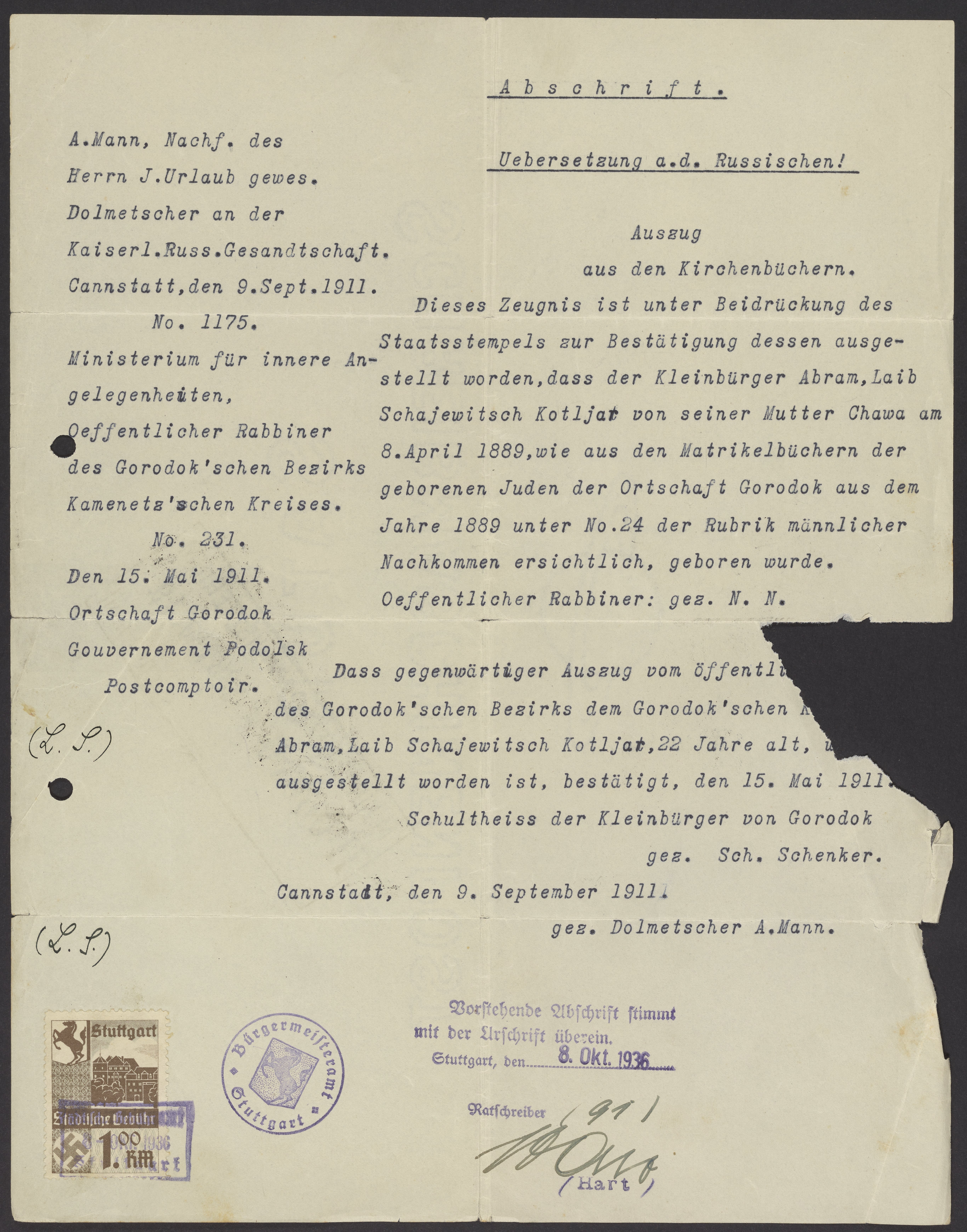 Bürgermeisteramt (Stuttgart, Germany). “Certificate of Birth for Abram Laib Schajewitsch Kotljar,” October 8, 1936. Papers of Gabor B. Levy, Box 1, Folder 1. Science History Institute. Philadelphia. https://digital.sciencehistory.org/works/pjjijxf.