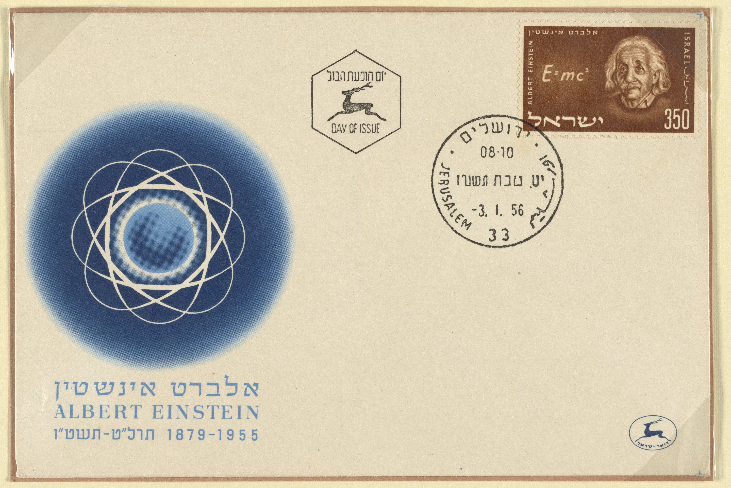 Hamori, George. “First Day Cover Commemorating Albert Einstein.” Israel, 1956. Witco Stamp Collection, Box 2. Science History Institute. Philadelphia. https://digital.sciencehistory.org/works/pk02c980t.