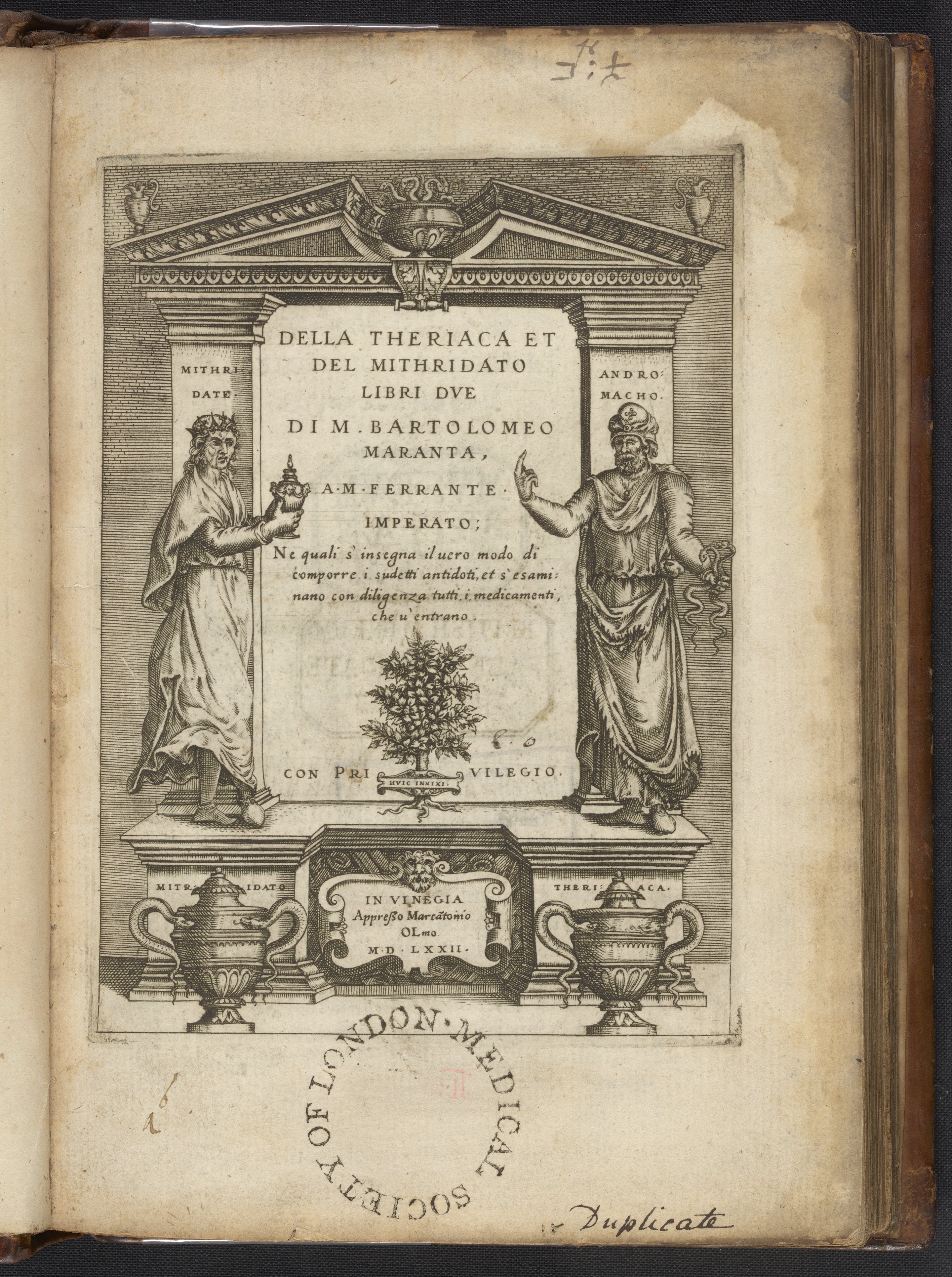 Maranta, Bartolomeo. Della Theriaca Et Del Mithridato Libri Due. Venice, Italy: Marcantonio Olmo, 1572. https://digital.sciencehistory.org/works/pk02cb76f.