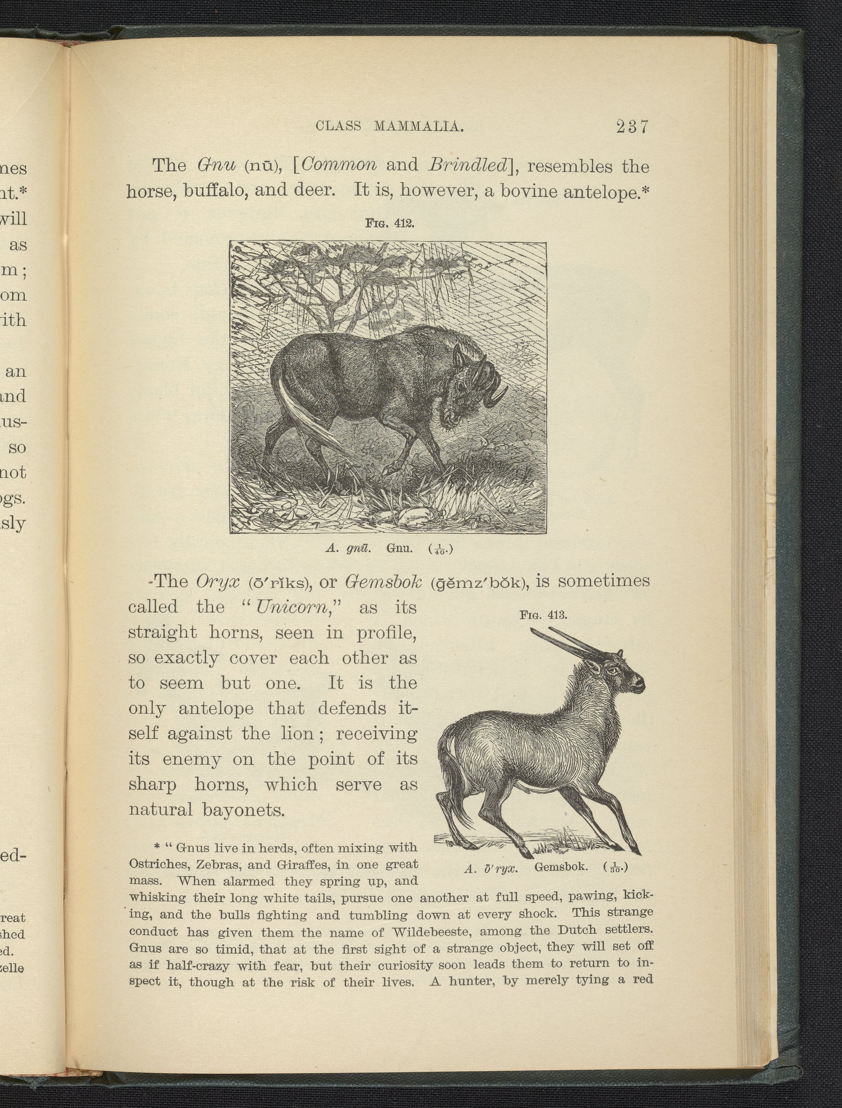 Steele, Joel Dorman, and Jenks, J. W. P. (John Whipple Potter). “Figure 412. Gnu. Figure 413. Gemsbok.” Popular Zoology. New York, New York: Chautauqua Press, 1887. https://digital.sciencehistory.org/works/pk3vqj3.