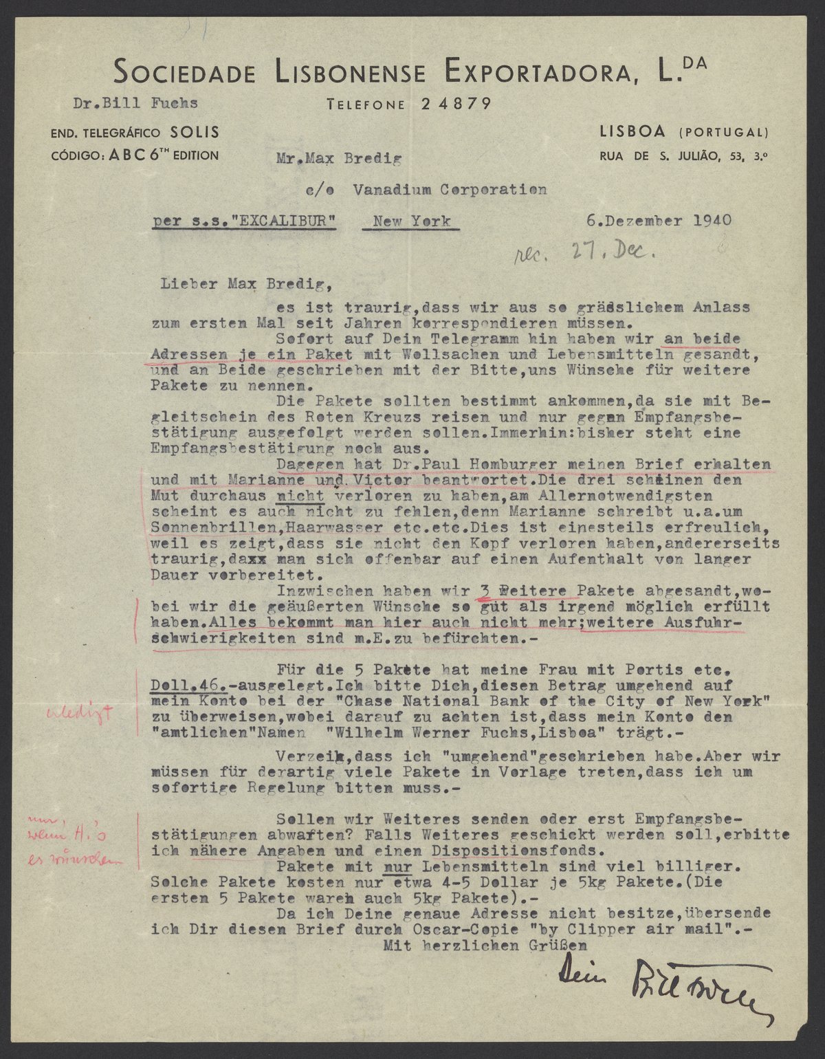 Bill Fuchs writes to Max Albert Bredig (1902-1977) from Lisbon, Portugal. He tells Max that he sent provisions to the Homburger family and that they were delivered to the Gurs internment camp by the Red Cross.