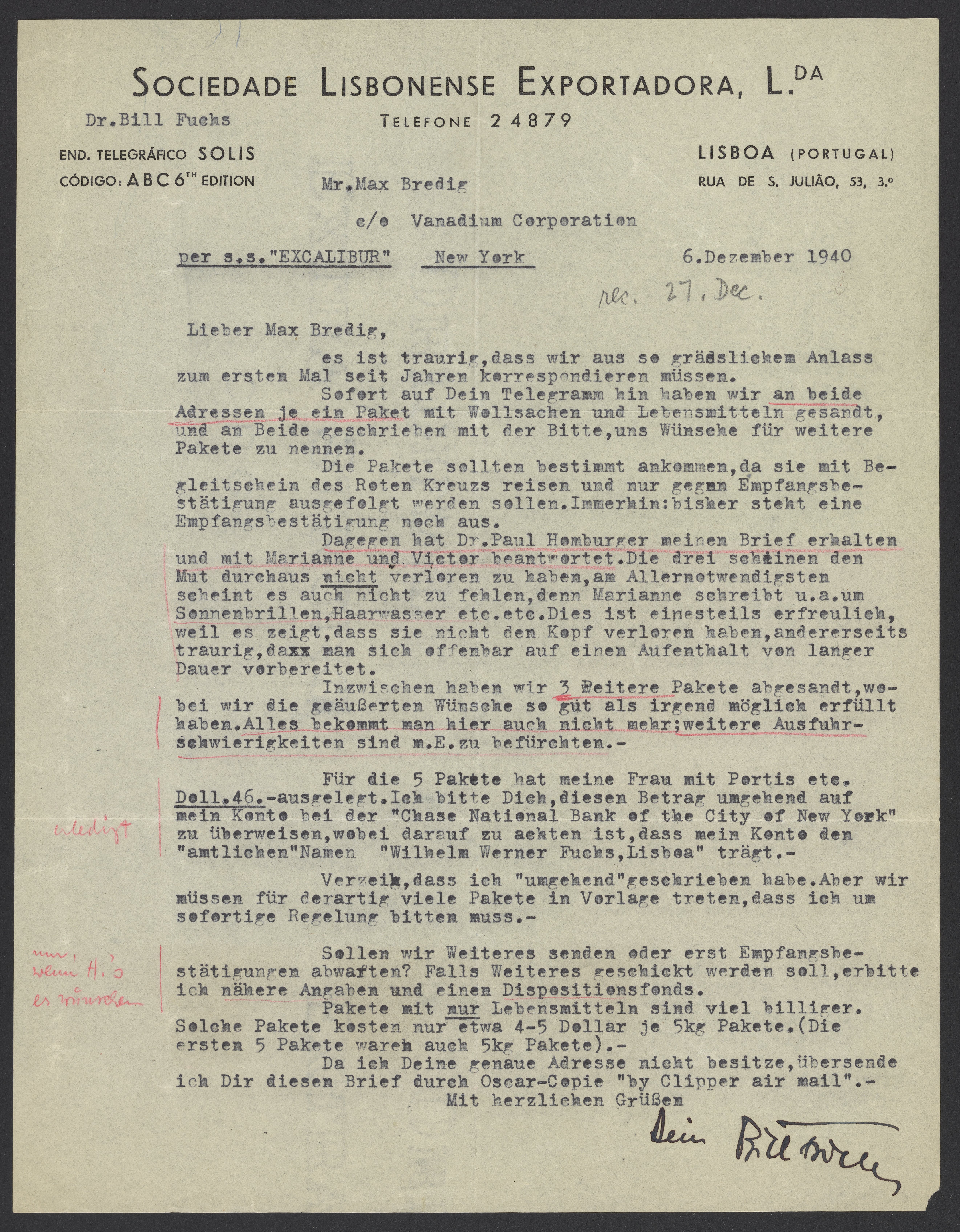 Für die 5 Pakete hat meine Frau mit Portis etc. Doll. 46. – ausgelegt. Ich bitte Dich, diesen Betrag umgend auf mein Konto bei der “Chase National Bank of the City of New York” zu überweisen, wobei darauf zu achten ist, dass mein Konto den “amtlichen” Namen “Wilhelm Werner Fuchs, Lisboa” trägt. –