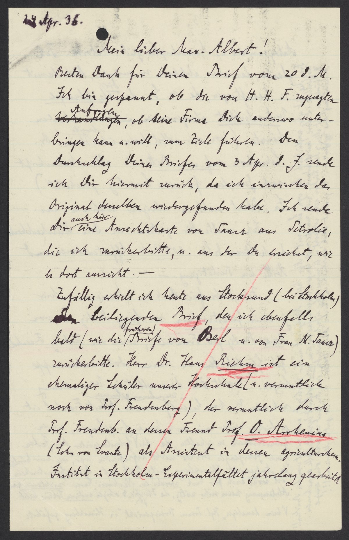 Zufällig erhielt ich heute aus Stocksund (bei Stockholm) beiliegenden Brief, den ich ebenfalls bald (wie die früheren Briefe von Berl u. von Frau N. Tausz) zurückerbitte. Herr Dr. Hans Riehm ist ein ehemaliger Schüler unserer Hochschule (u. vermutlich noch von Prof. Freudenberg), der vermutlich durch Prof. Freudenb. an dessen Freund Prof. O. Arrhenius (Sohn von Svante) als Assistent in dessen agriculturchem. Institut in Stockholm-Experimentalfätet jahrelang gearbeitet hat.