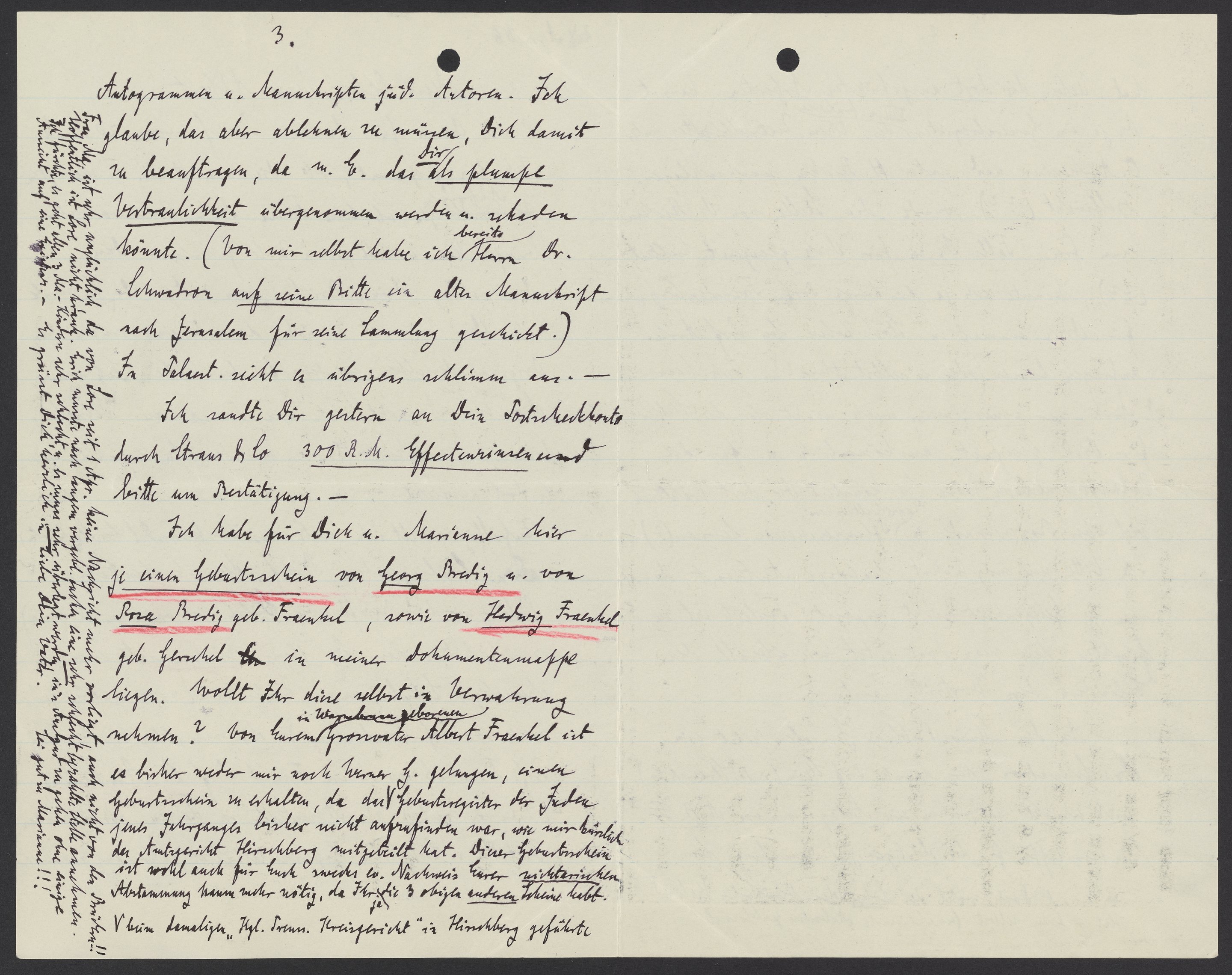 Ich habe für Dich u. Marianne hier je einen Geburtsschein von Georg Bredig u. von Rosa Bredig geb. Fraenkel, sowie von Hedwig Fraenkel geb. Gerschel in meiner Dokumentenmappe liegen. Wollt Ihr diese selbst in Verwahrung nehmen? Von Eurem in Wapbrunn geborenen Grossvater Albert Fraenkel ist es bisher weder mir noch Werner G. gelungen, einen Geburtsschein zu erhalten, da das ^ beim damaligen Kgl. Preuss. Kriegsgericht“ in Hirschberg geführte ^ Geburtsregister der Juden jenes Jahrganges bisher nicht aufzufinden war, wie mir kürzlich der Amtsgericht Hirschberg mitgeteilt hat. Dieser Geburtsschein ist wohl auch für Euch zwecks ev. Nachweis Eurer nichtarischen Abstammung kaum mehr nötig, da Ihr ja die 3 obigen anderen Scheine habt.