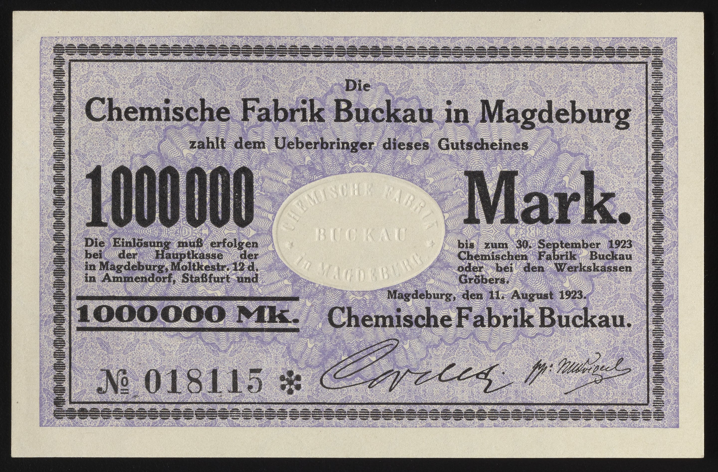 “Chemische Fabrik Buckau Eine Million Mark Gutschein.” Magdeburg, Germany: Chemische Fabrik Buckau, August 11, 1923. Robert J. Bauman collection. Science History Institute. Philadelphia. https://digital.sciencehistory.org/works/pn89d7491.