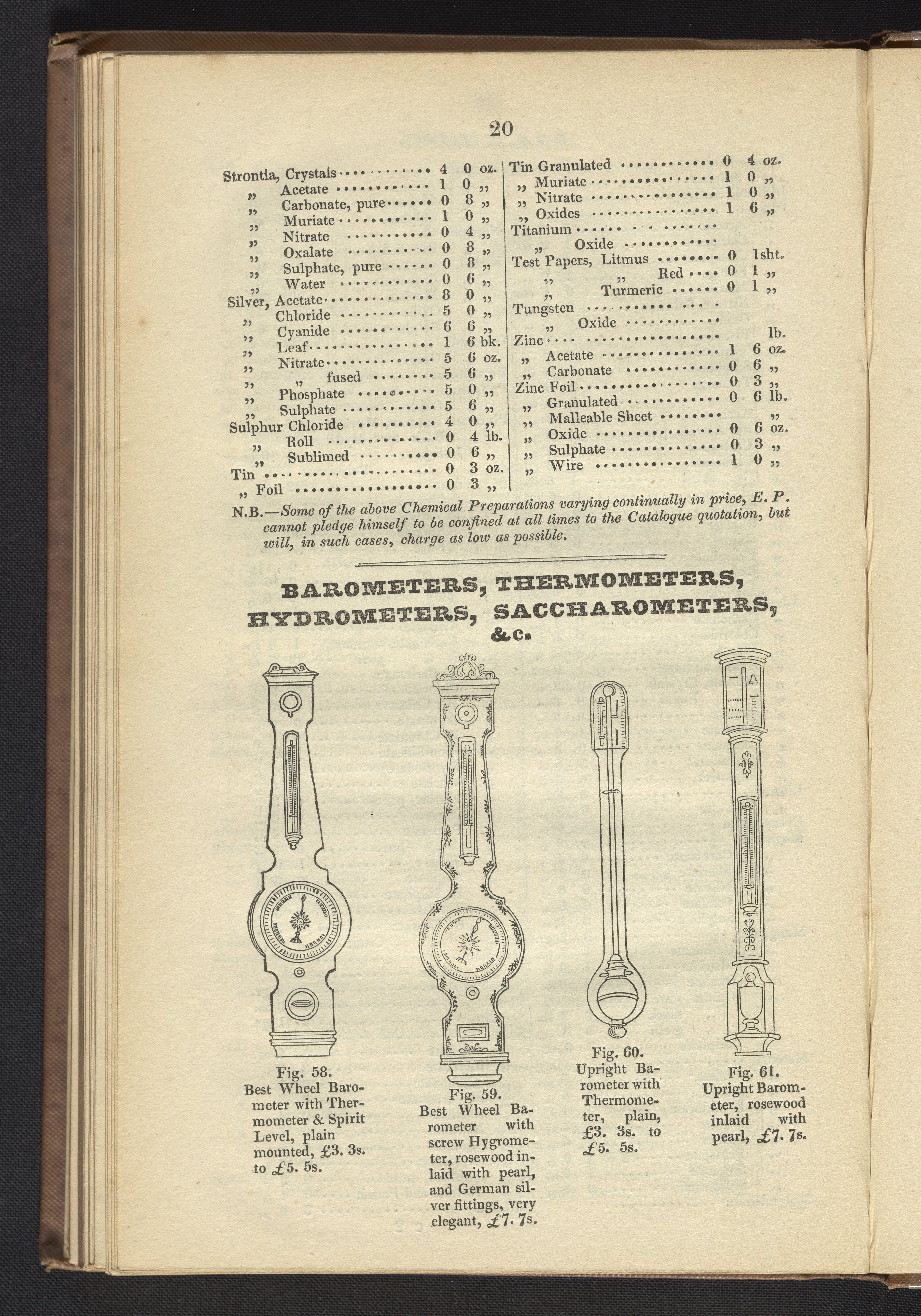 Palmer, Edward. “Figures 58-61. Barometers.” In Palmer's New Catalogue, with Three Hundred Engravings of Apparatus, Illustrative of Chemistry, Pneumatics, Frictional and Voltaic Electricity, Electro Magnetism, Optics, &c. London, England: William Gilbert, 1840. https://digital.sciencehistory.org/works/pp4c0jv.