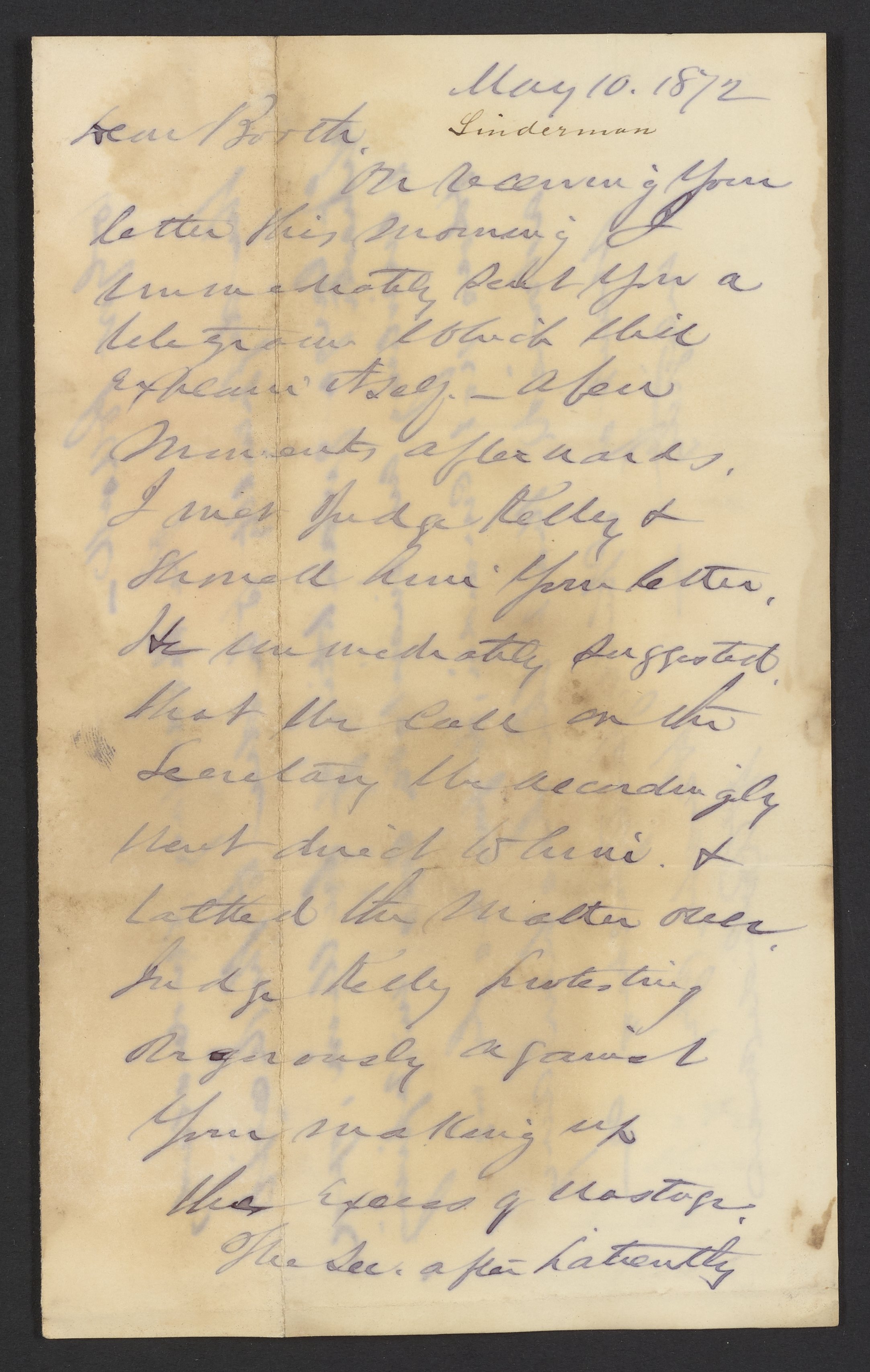 Letter from H. R. Linderman to James Curtis Booth, May 10, 1872