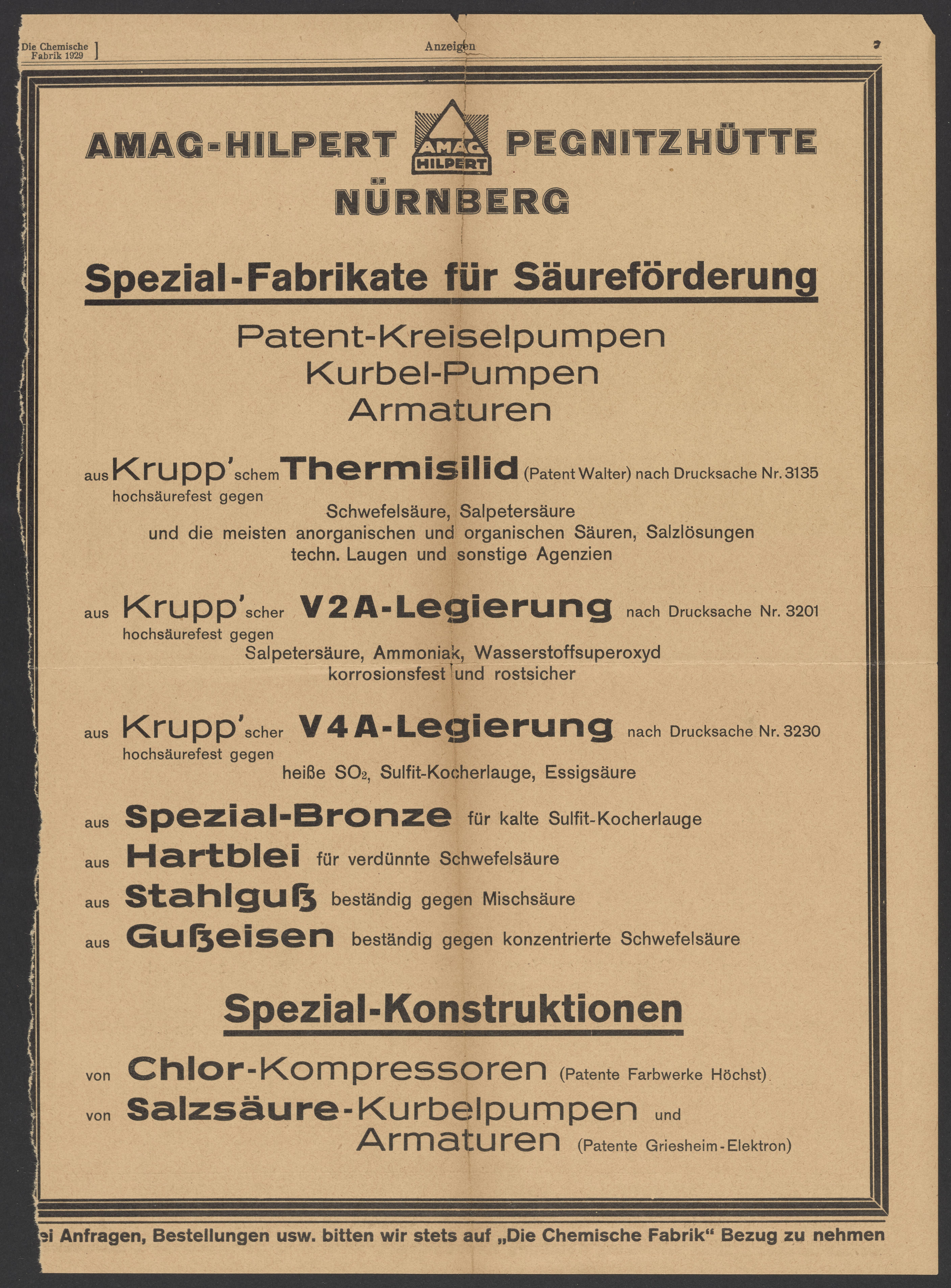 W. Busching & Co. “Spezial-Fabrikate Für Säureförderung,” 1929. Papers of Georg and Max Bredig, Box 3, Folder 3. Science History Institute. Philadelphia. https://digital.sciencehistory.org/works/pr8v5c1.