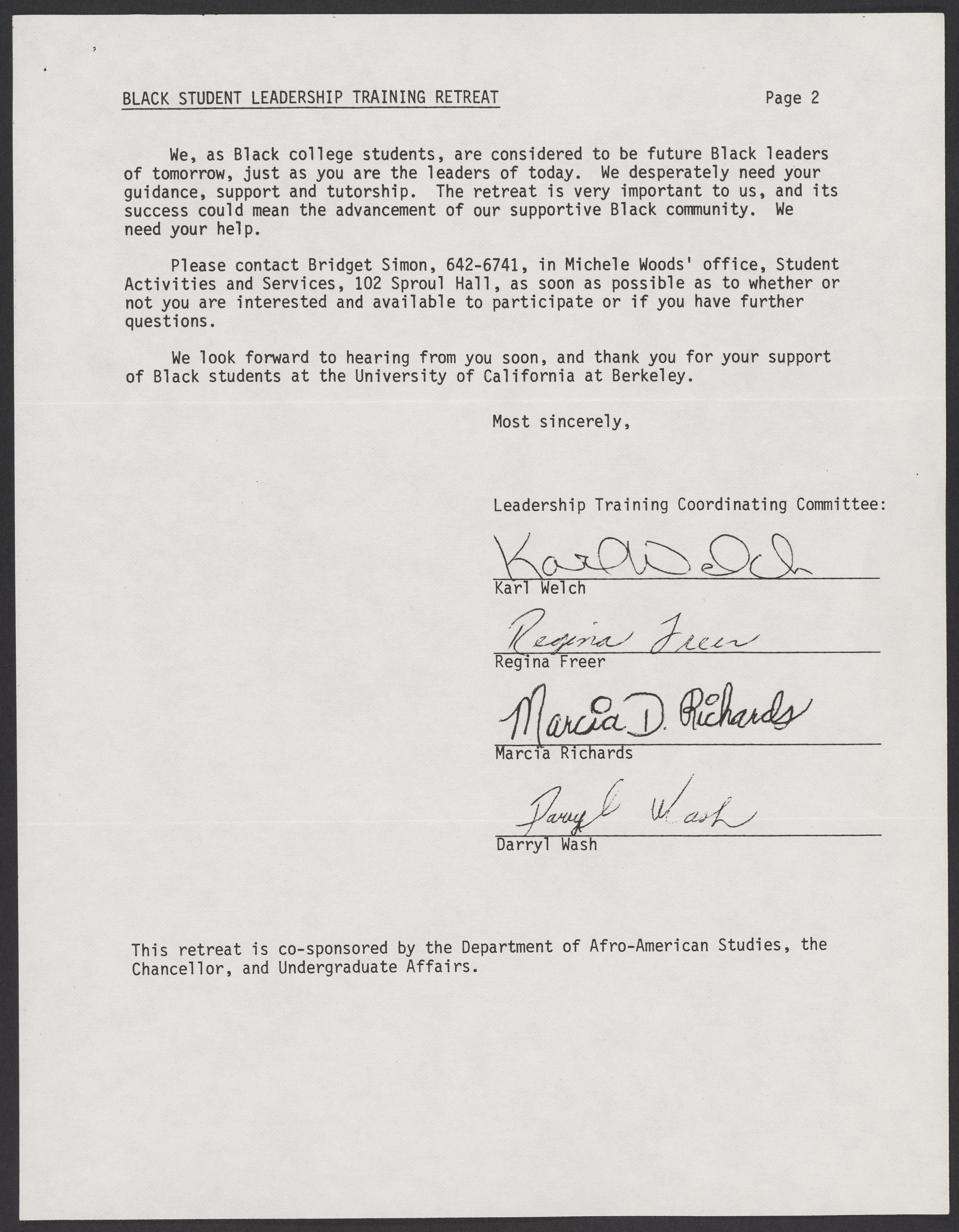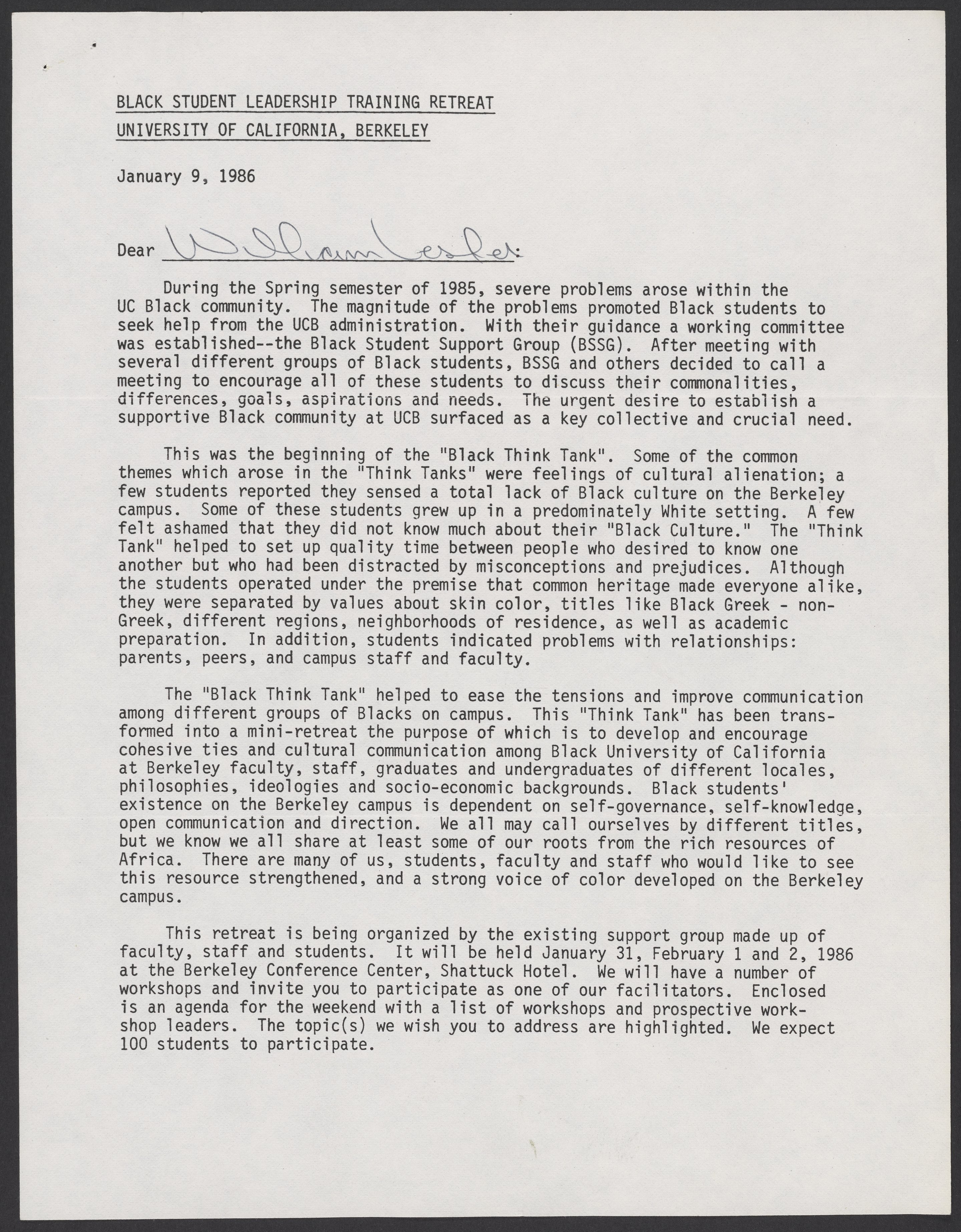 Letter from the Black Student Leadership Committee at the University of California, Berkeley, inviting William A. Lester, Jr. (1937-) to participate in an upcoming retreat.