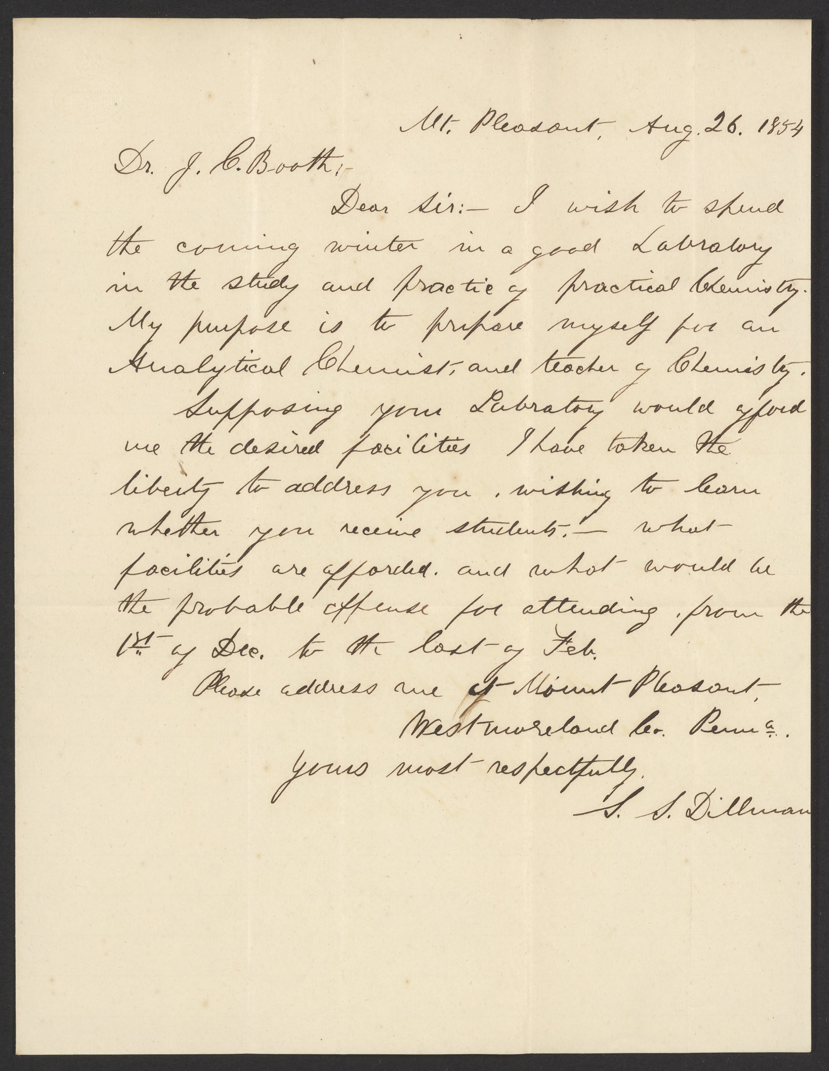 Dilman, S. S. “Letter from S.S. Dilman to James Curtis Booth, August 26, 1854,” August 26, 1854. Papers of James Curtis Booth, Box 1, Folder 6. Science History Institute. Philadelphia. https://digital.sciencehistory.org/works/pv23msh.