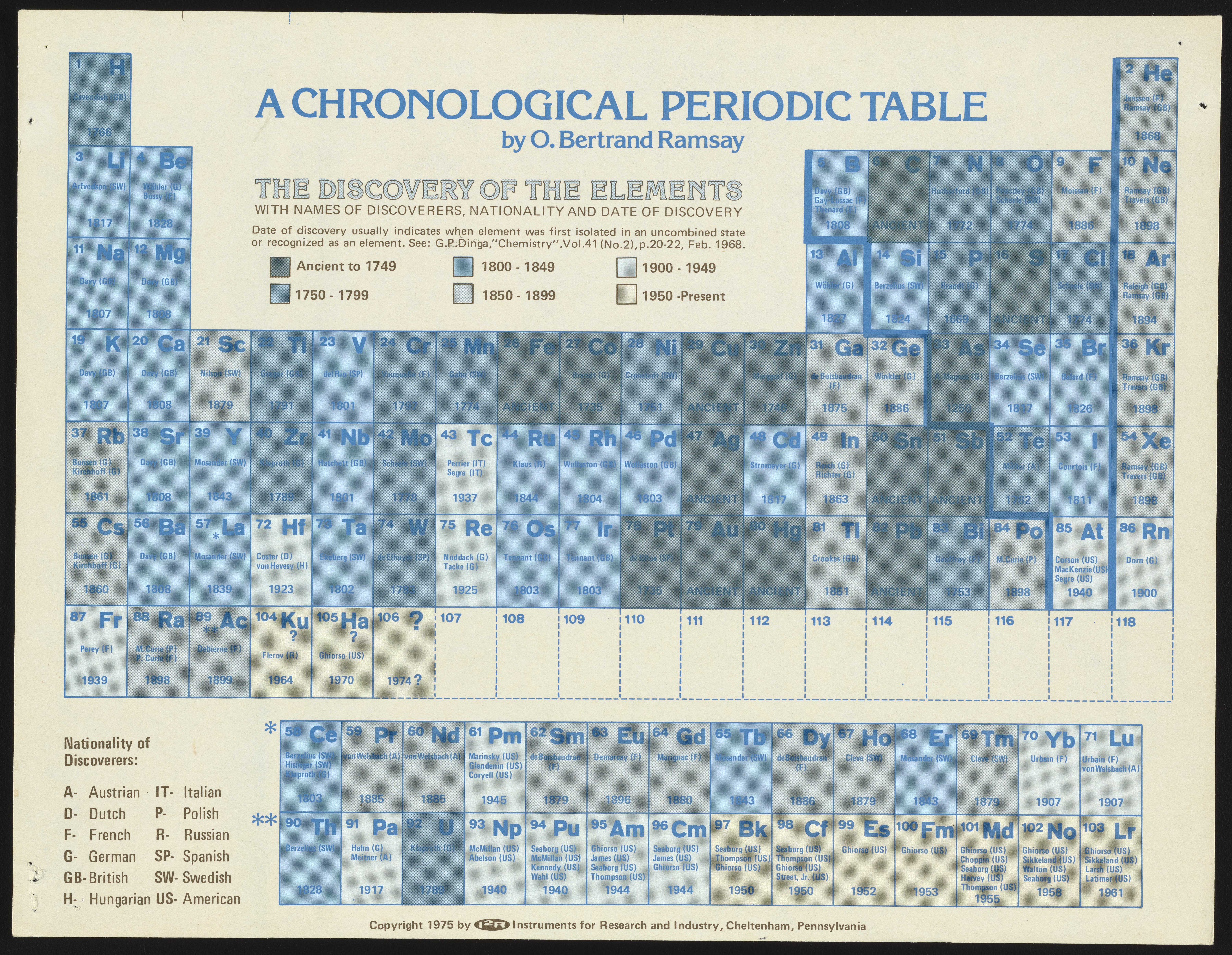 Ramsay, O. Bertrand. “A Chronological Periodic Table.” Cheltenham (Township), Pennsylvania: Instruments for Research and Industry, 1975. Periodic Tables Collection, Box FC-5, Folder Periodic Tables (Assorted). Science History Institute. Philadelphia. https://digital.sciencehistory.org/works/pv63g132b.