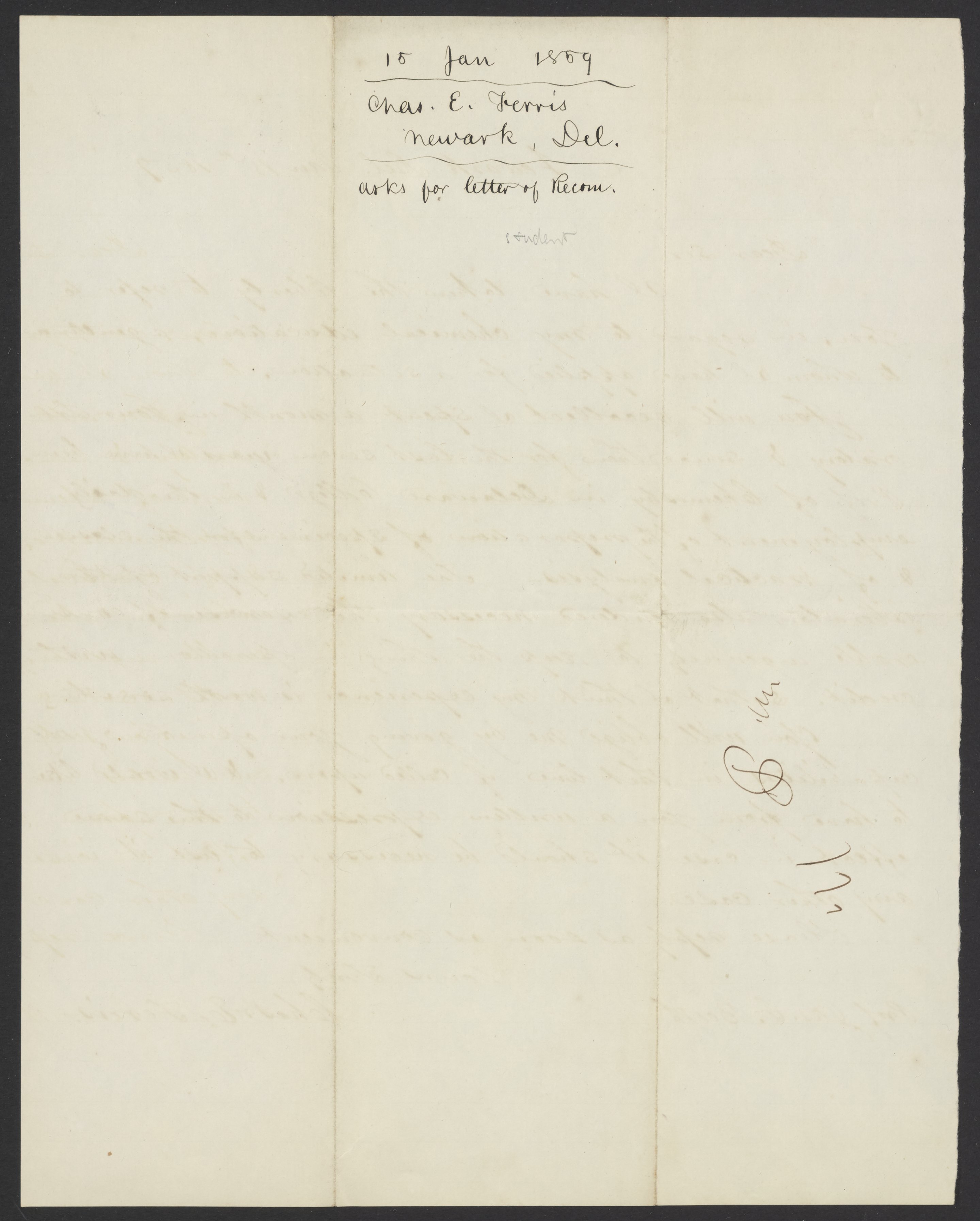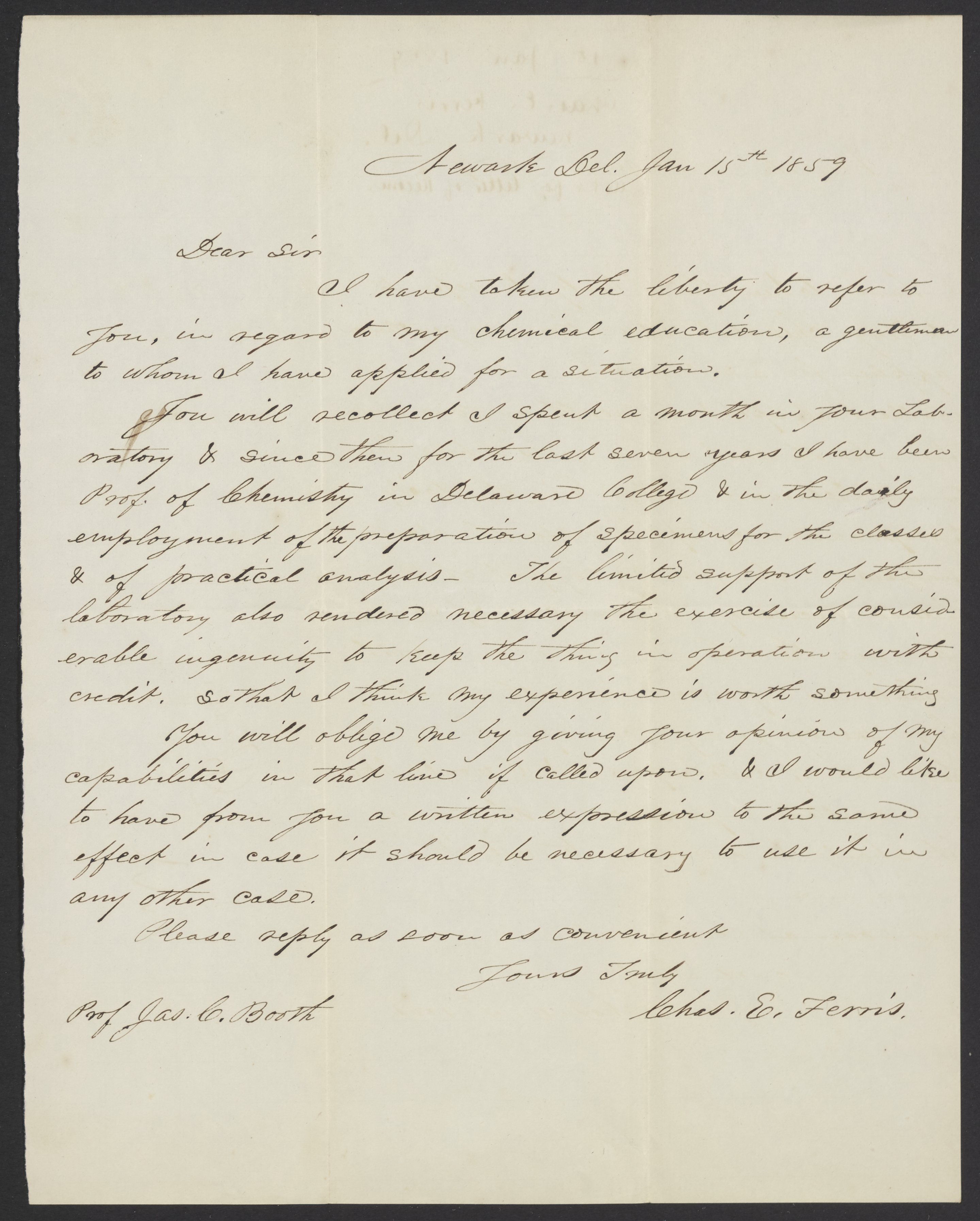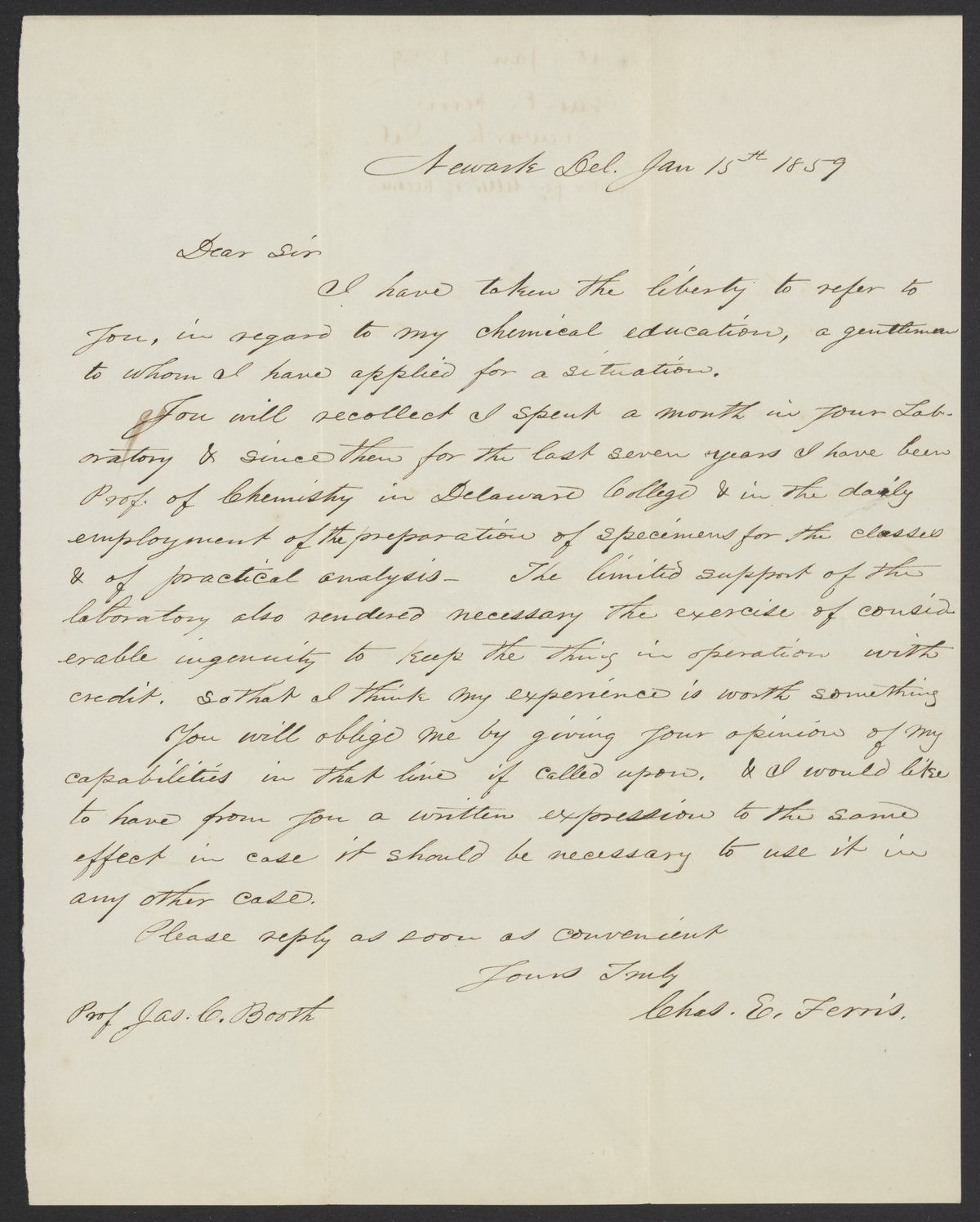 Ferris, Charles. “Letter from Charles Ferris to James Curtis Booth, January 15, 1859,” January 15, 1859. Papers of James Curtis Booth, Box 1, Folder 7. Science History Institute. Philadelphia. https://digital.sciencehistory.org/works/pvkmp6i.