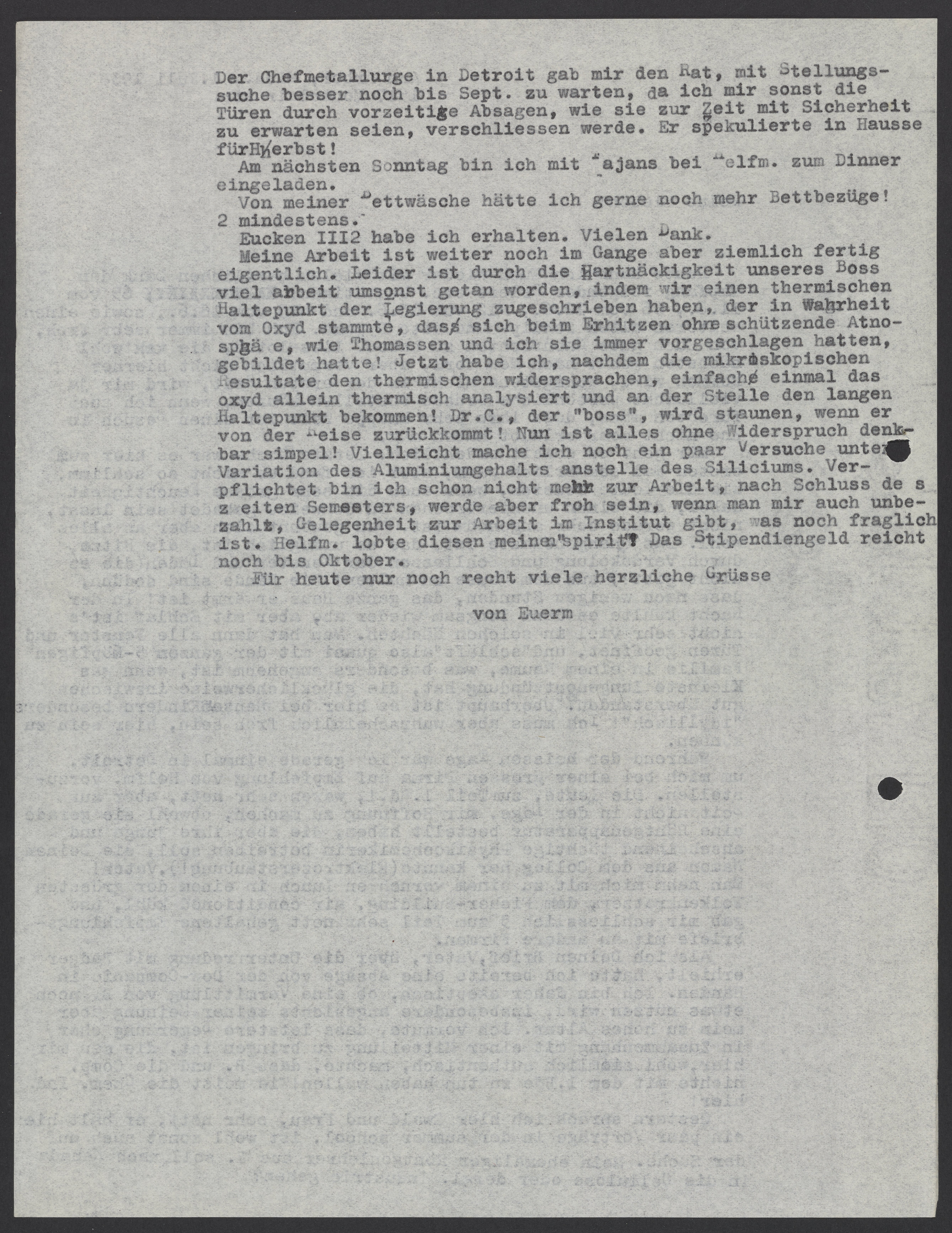 Meine Arbeit ist weiter noch im Gange aber ziemlich fertig eigentlich. Leider ist durch die Hartnäckigkeit unseres Boss viel Arbeit umsonst getan worden, indem wir einen thermischen Haltepunkt der Legierung so geschrieben haben, der in Wahrheit vom Oxyd stammte, das wich beim Erhitzen eine schützende Atmosphäre, wie Thomassen und ich wie immer vorgeschlagen hatten, gebildet hatte! Jetzt habe ich, nachdem die mikroskopischen Resultate den thermischen widersprachen, einfach einmal das oxyd allein thermisch analysiert und an der Stelle den langen Haltepunkt bekommen! Dr. C., der "boss", wird staunen, wenn er Reise zurückkommt! Nun ist alles ohne Widerspruch denkbar simpel! Vielleicht mache ich noch ein paar Versuche unter Variation des Alumiumgehalts anstelle des Siliciums. Verpflichtet bin ich schon nicht mehr zur Arbeit, nach Schluss des zeiten Semester, werde aber froh sein, wenn man mir unbezahlt, Gelegenheit zur Arbeit im Institut gibt, was noch fraglich ist. Helf. lobte diesem meinem "spirit"! Das Stipendiengeld reicht noch bis Oktober.