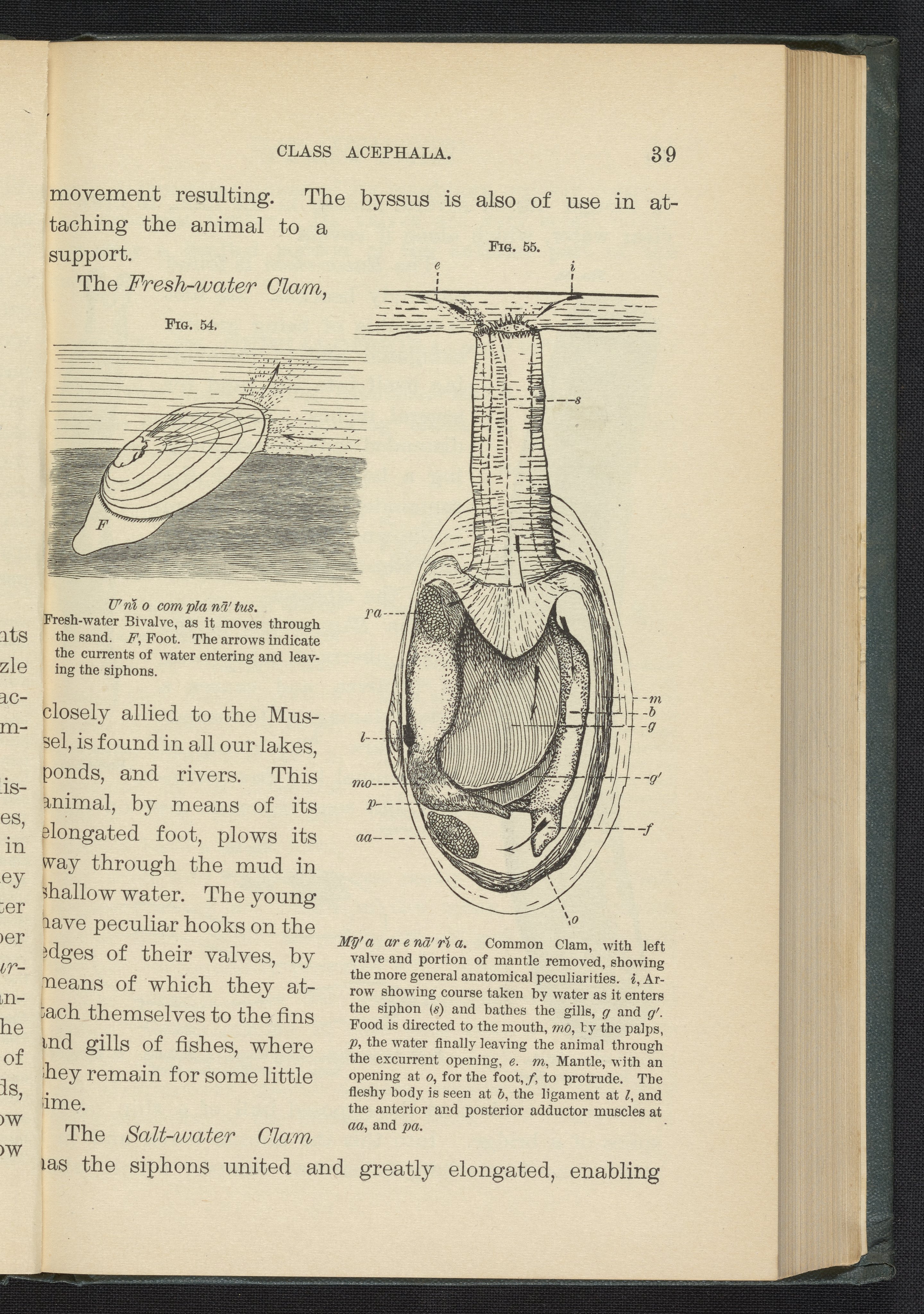 Figures 54 and 55 of the 1887 volume Popular Zoology. Figure 54 depicts a fresh-water bivalve clam as it moves through sand. Figure 55 depicts a common clam, with the left valve and portion of mantle removed, showing the more general anatomical peculiarities.