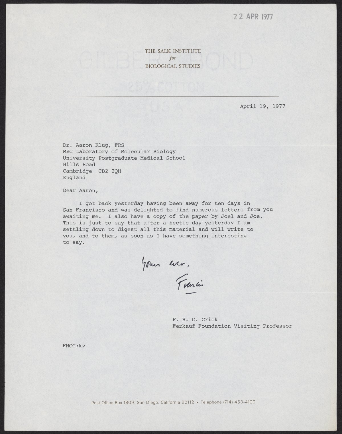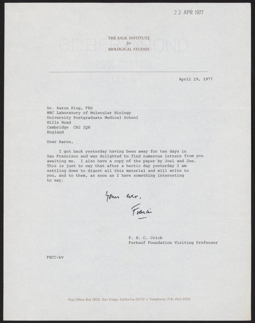 Crick, Francis. “Letter from Francis Crick to Aaron Klug, April 19, 1977,” April 19, 1977. History of Molecular Biology Collection, Box 20, Folder 1. Science History Institute. Philadelphia. https://digital.sciencehistory.org/works/pwu2qw7.