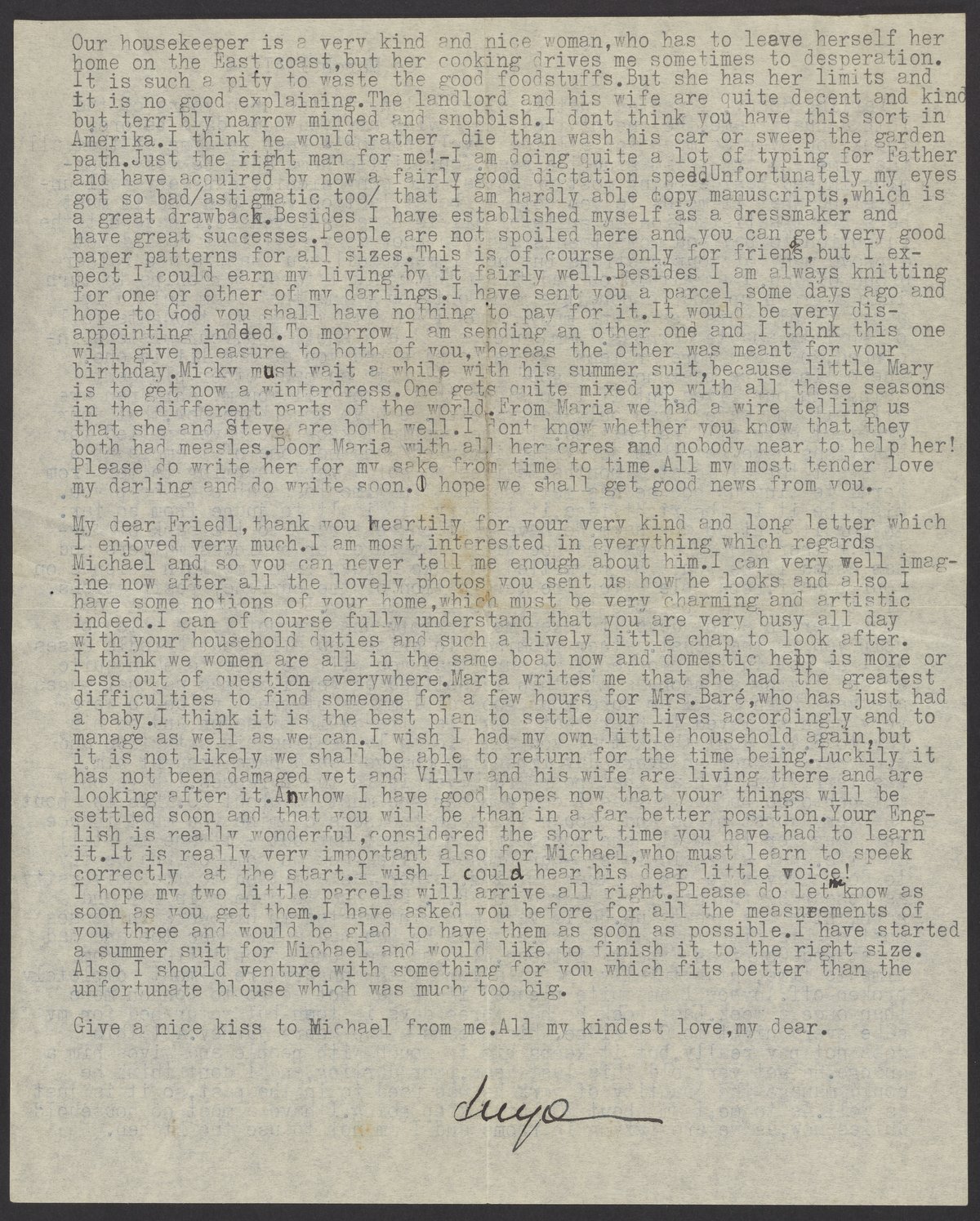 Letter to Gabor B. Levy (1913-1999) from his mother Margaret Levy (1886-1975), who signs as "Suya." Includes a section addressed to Gabor's wife, Freidl Levy (1913-).