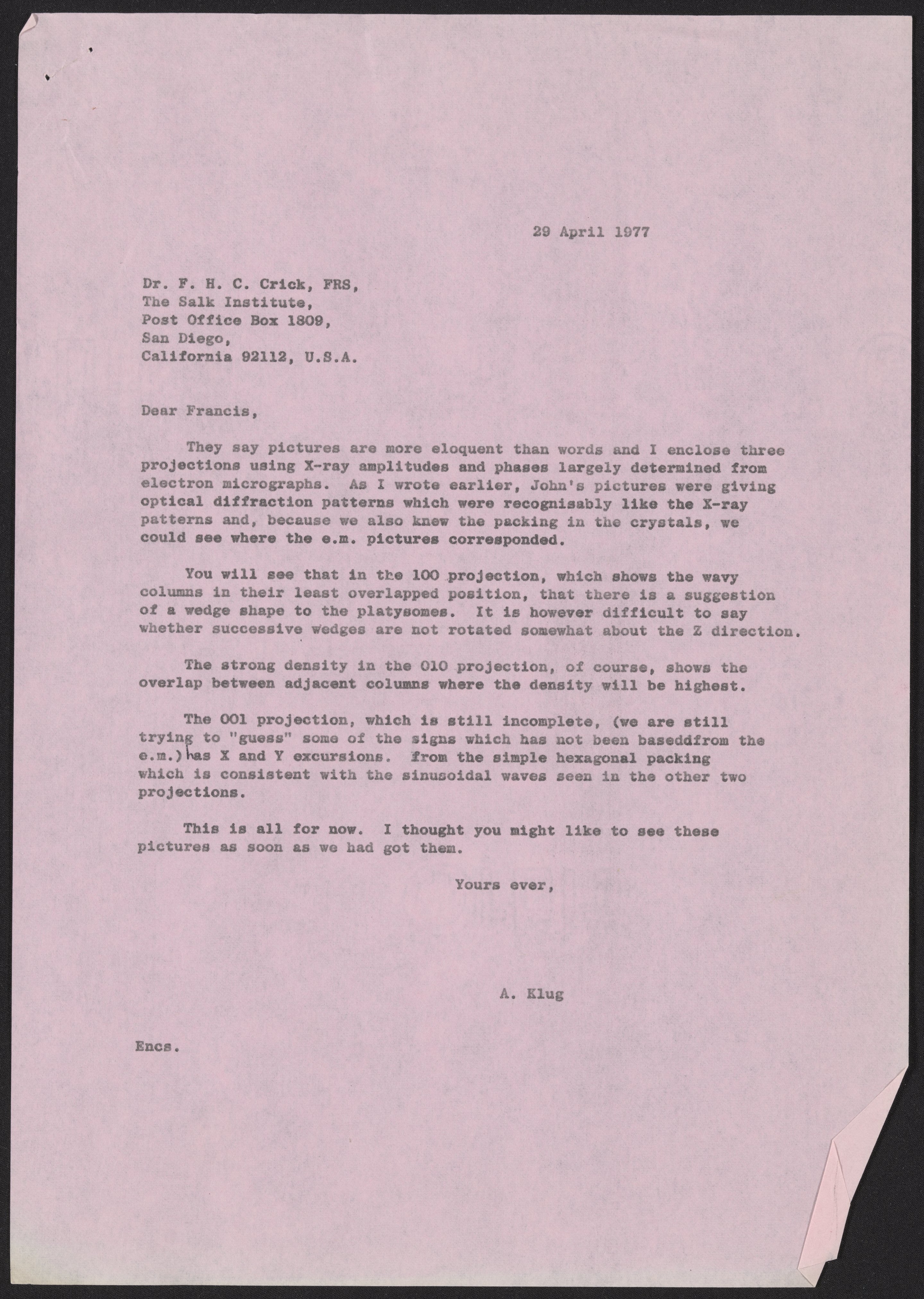 Klug, A. (Aaron), Sir. “Letter from Aaron Klug to Francis Crick, April 29, 1977,” April 29, 1977. History of Molecular Biology Collection, Box 20, Folder 1. Science History Institute. Philadelphia. https://digital.sciencehistory.org/works/pz0b2t9.