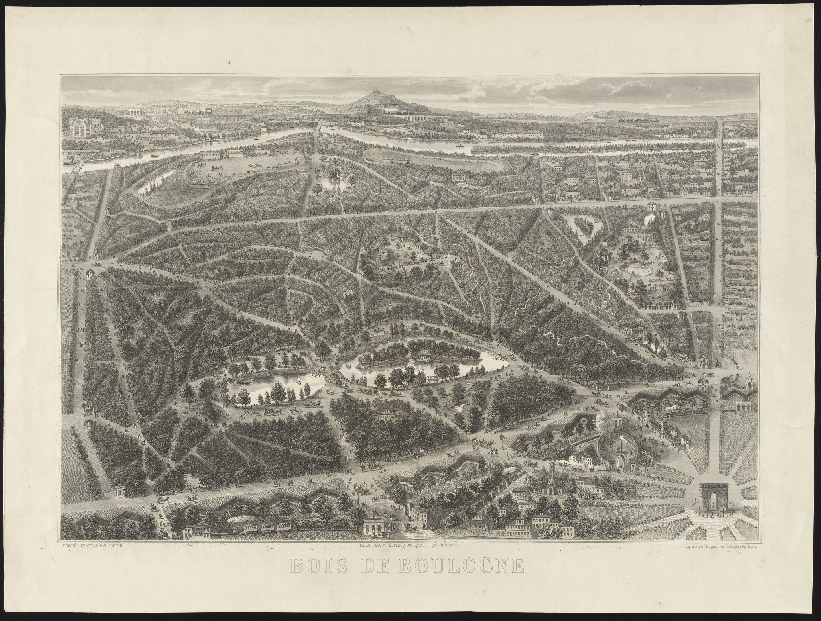 This bird's-eye aerial view of Paris by engraver Marie-Hilaire Guesnu (1802-1880) shows the Bois de Boulogne, a large park located in the 16th arrondissement of Paris, on the western edge of the city. The park was conceived by Napoleon III and Georges-Eugène Haussmann as part of the reconstruction of Paris and was built between 1852 and 1858.