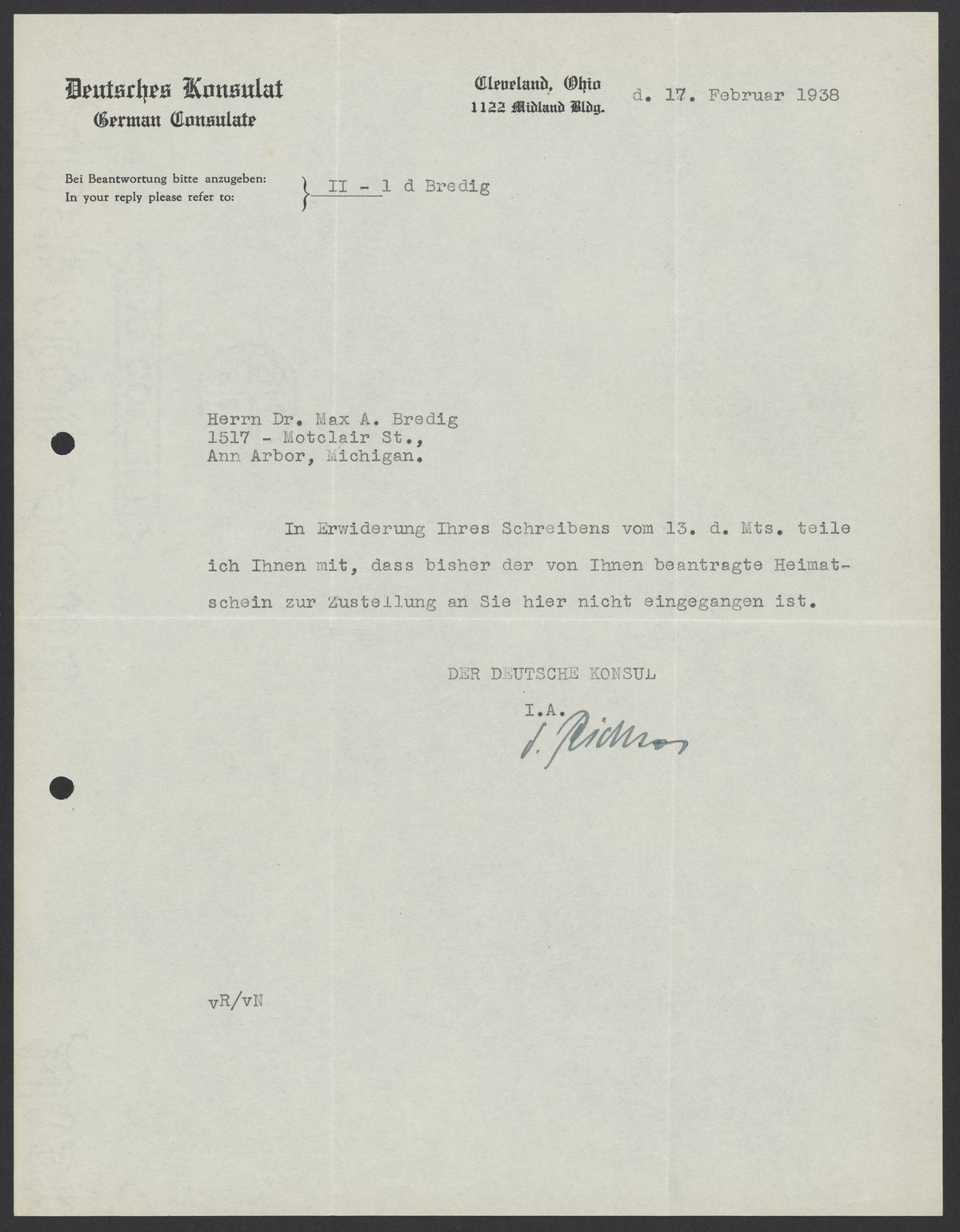 Letter from the German Consul to Max Bredig, February 17, 1938