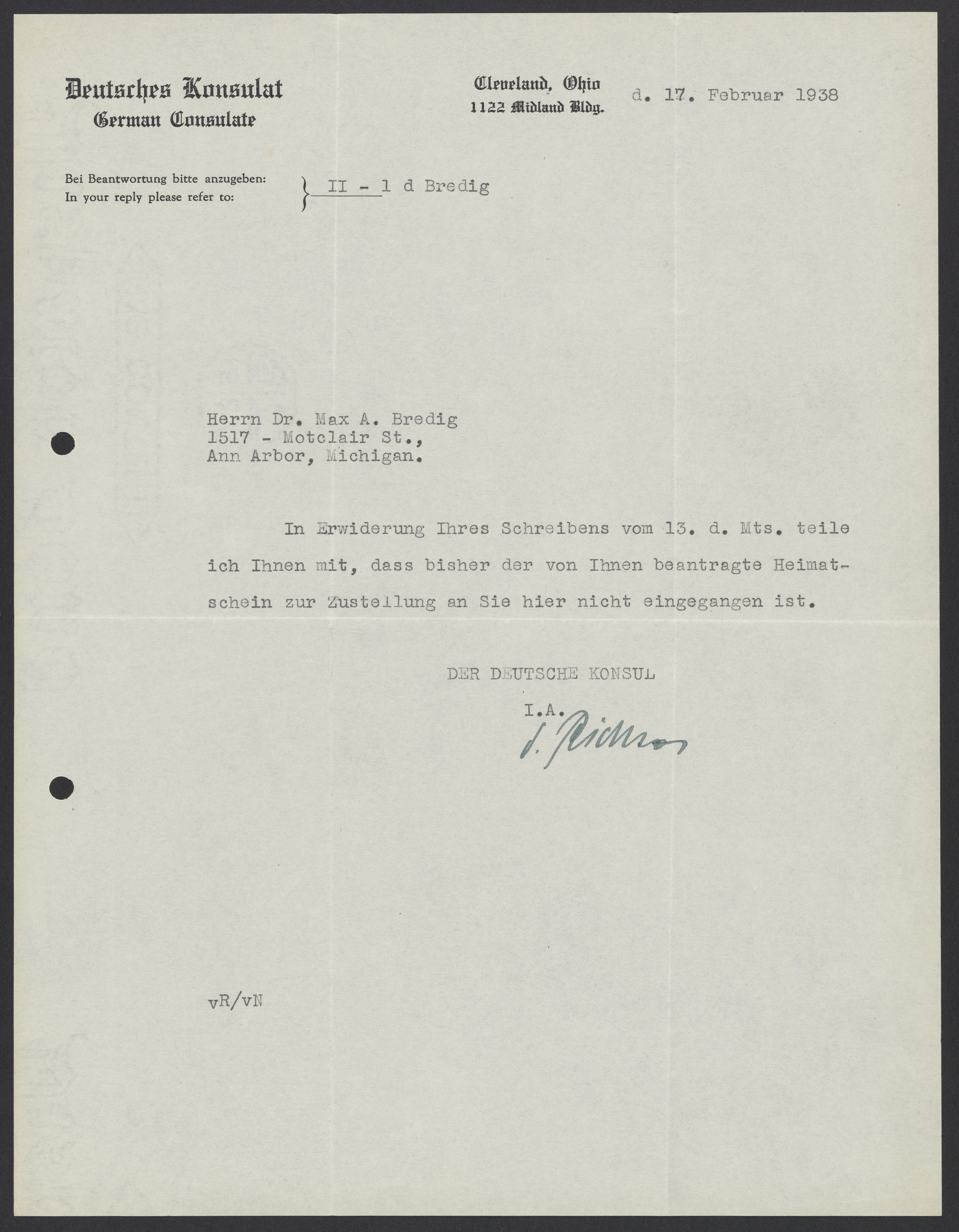 Letter from the German Consul to Max Bredig, February 17, 1938