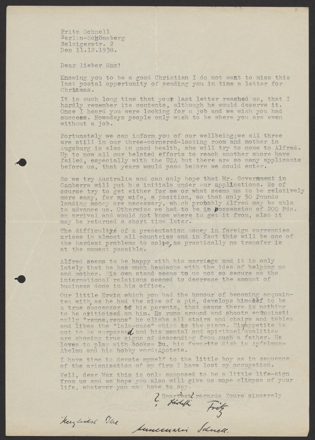 Letter from Federico and Annemarie Schnell to Max Bredig, December 11, 1938