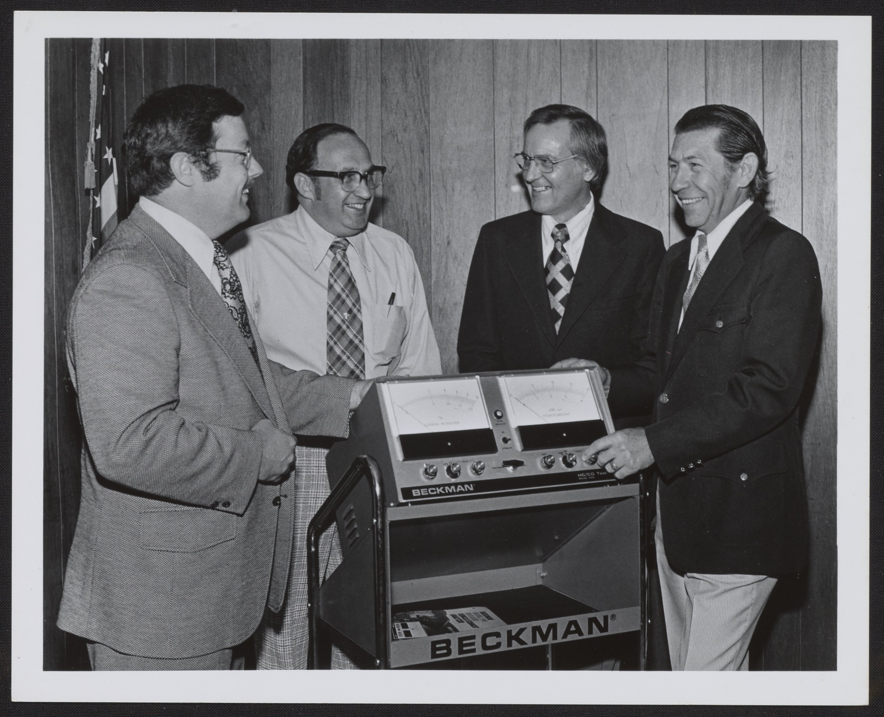 Four unidentified men flank a Beckman HC/CO tester. This instrument detects pollutants in the exhaust from vehicles with combustion engines.