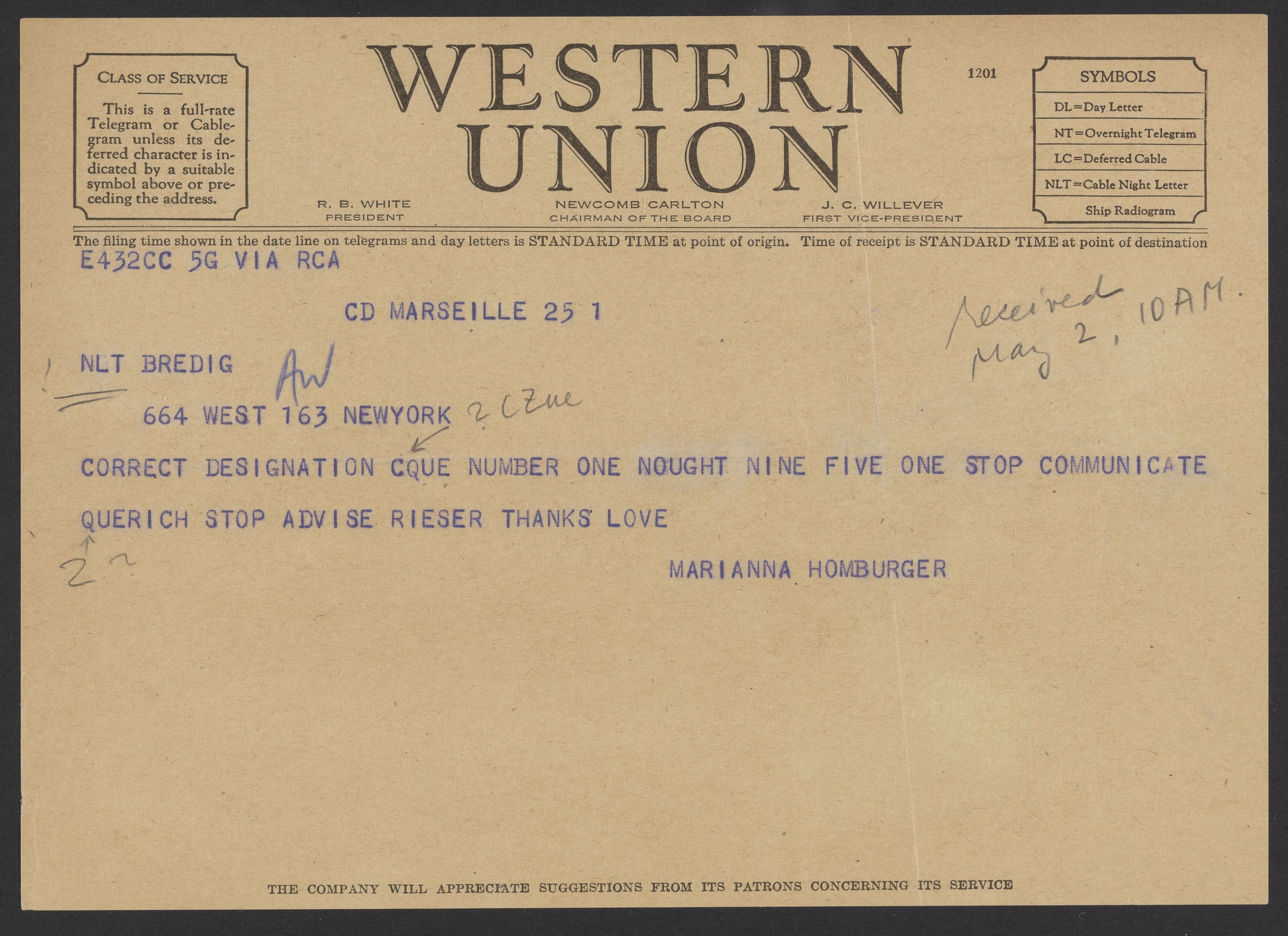 Homburger, Marianne. “Telegram from Marianne Homburger to Max Bredig, April 1941,” April 1941. Papers of Georg and Max Bredig, Box 7, Folder 24. Science History Institute. Philadelphia. https://digital.sciencehistory.org/works/q386d91.