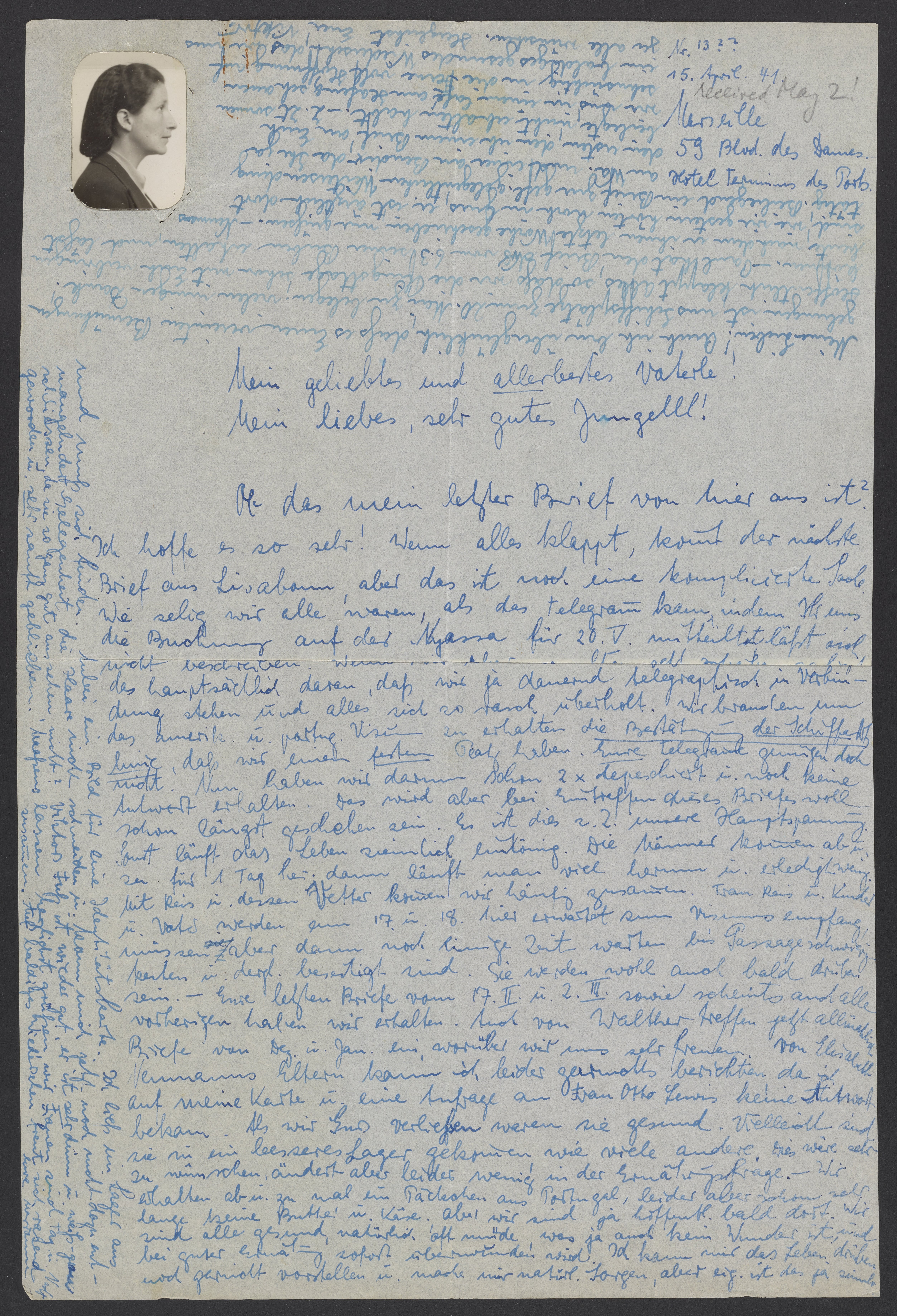 Is this my last letter from here? I really hope so! If everything goes well, the next letter will come from Lisbon, but that’s still a complicated matter. How blissful we all were when the telegram arrived informing us that you booked us on the Nyassa for May 20th! This is an indescribable act of salvation. However, if we don’t write very often at the moment, it’s mainly because we’re constantly in touch by telegram and everything becomes outdated so quickly. In order to obtain the American and parting visas, we need confirmation from the ship company that we have a permanent place. Your telegrams are not enough! We have already sent two telegrams and have not yet received an answer. However, by the time this letter arrives, that will have already happened a long ago. This is currently our main worry. Otherwise, life is pretty monotonous. The men visit from time to time for 1 day. Afterwards, you walk around a lot and don’t do very much. We often get together with Reis and his cousin. Ms. Reis, their children, and her father are expected here on the 17th and 18th to obtain their visas. However, they must wait for some time until some difficulties with the ship fare are resolved. They’ll probably be over there soon too. We have received your last letters from February 17th and March 2nd , as well as all the previous ones. Walther’s letters from December and January are also gradually arriving, which we are very happy about. Unfortunately, I can't tell you anything about Elisabeth Neumann’s parents, because I didn’t receive an answer to my card or to my inquiry with Mrs. Otto Lewis. When we left Gurs, they were healthy. Perhaps they ended up in a better camp, like many others. That would be very advantageous, but unfortunately it doesn't change much regarding expectations. From time to time, we receive a parcel from Portugal, but unfortunately haven’t received butter or cheese for a long time. Nonetheless, hopefully we’ll be there soon. We are all healthy and of course we are often tired. No wonder! This can be resolved immediately with good nutrition. I can’t even imagine life over there. Of course, I'm worried, but it’s actually pointless and
