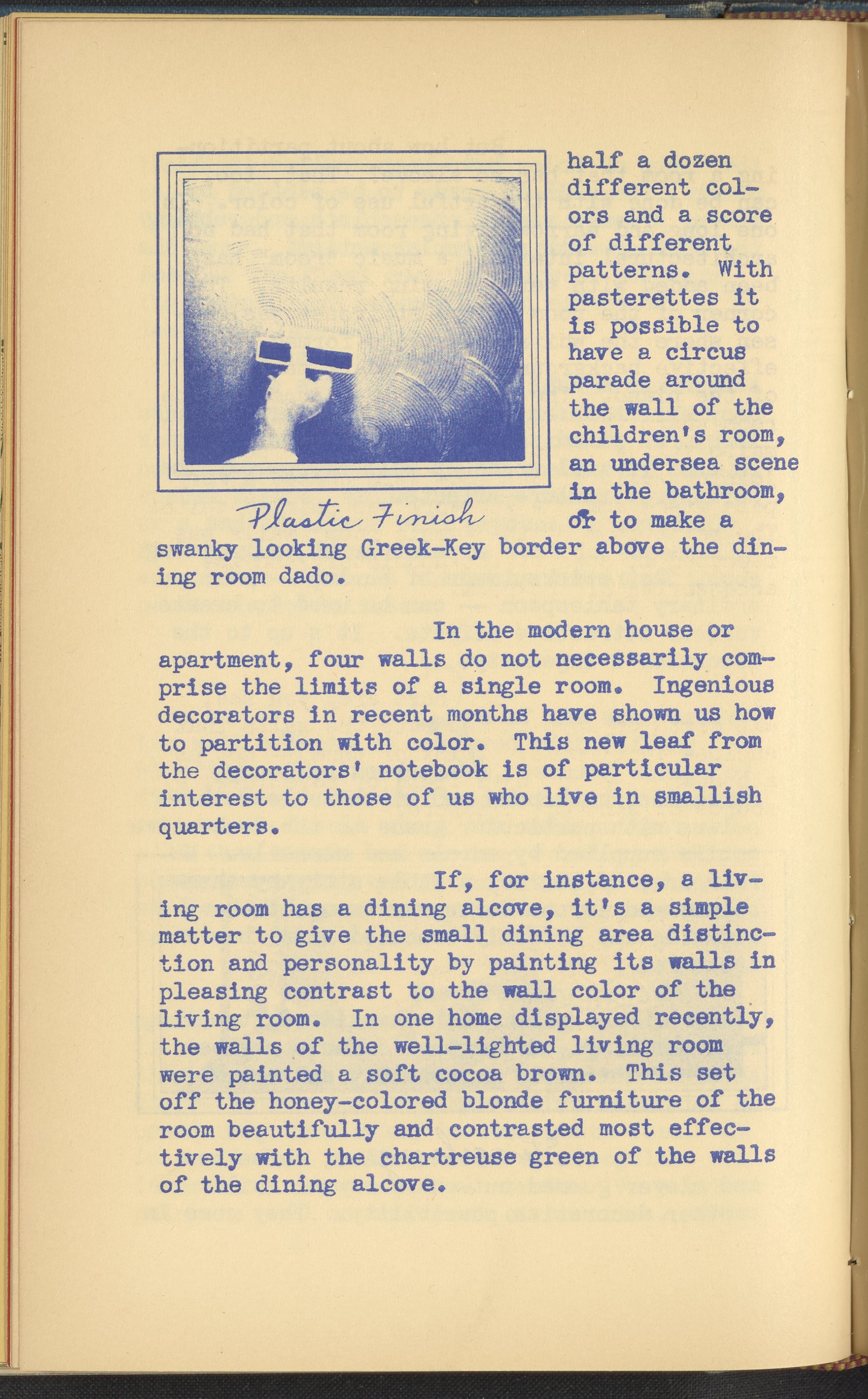Booklet corresponding to a radio broadcast program created by the National Paint, Varnish, and Lacquer Association. The booklet discusses various methods to decorate one's walls. These methods include stippling, scumbling, murals, plastics, pasterettes, and stenciling. Describes each technique and where it is most effectively employed. Includes small stylized illustrations throughout and decorated covers.