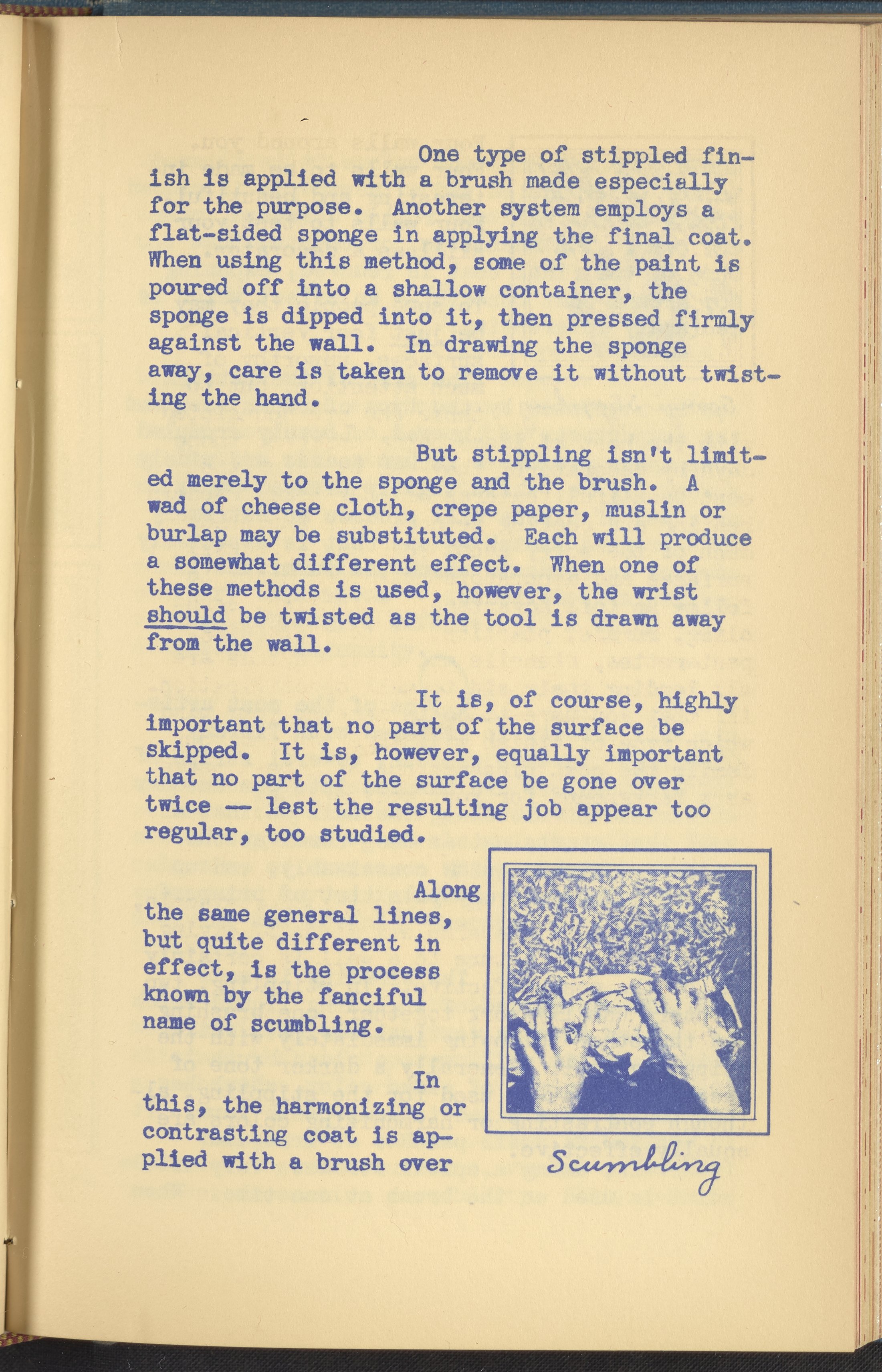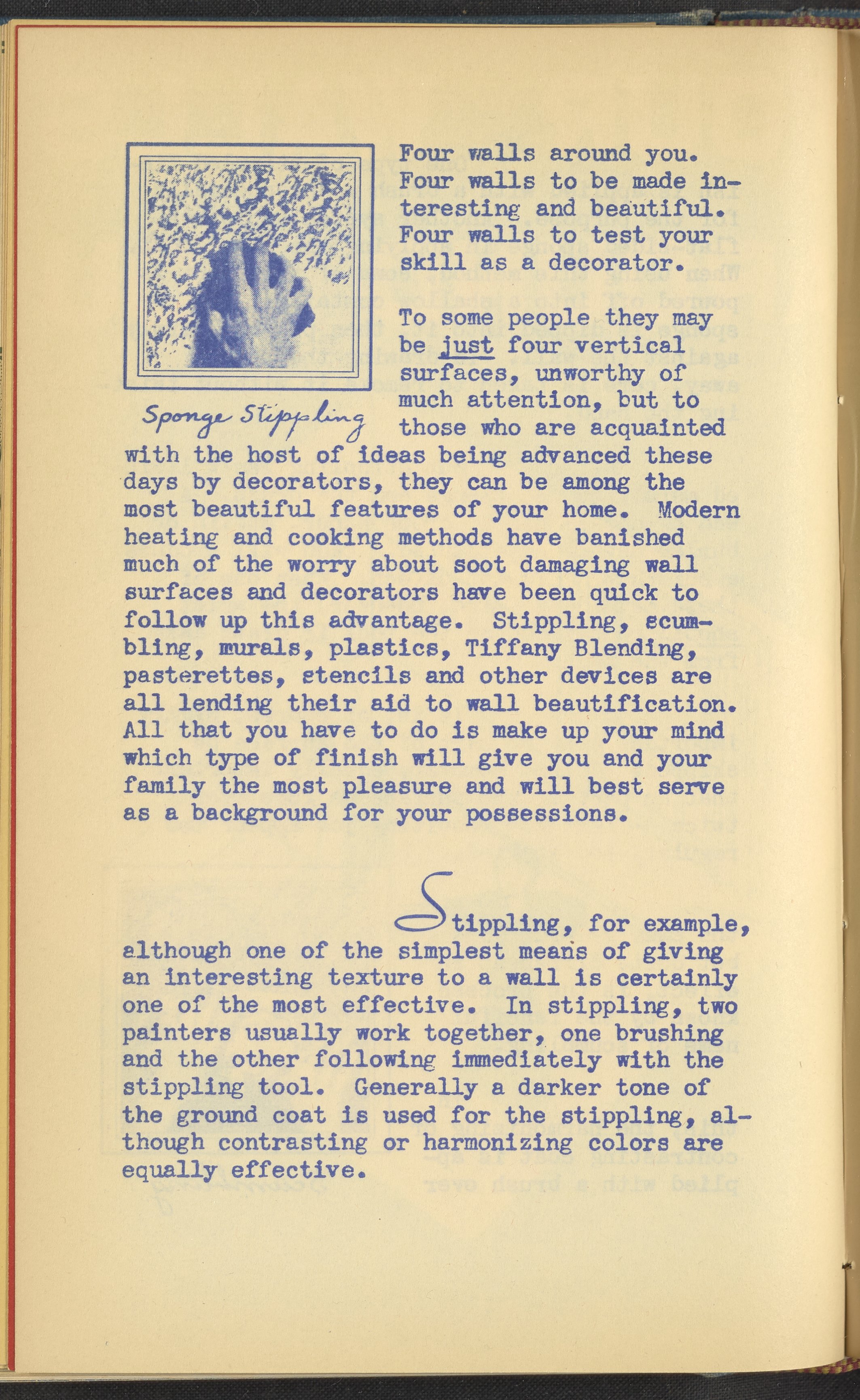 Booklet corresponding to a radio broadcast program created by the National Paint, Varnish, and Lacquer Association. The booklet discusses various methods to decorate one's walls. These methods include stippling, scumbling, murals, plastics, pasterettes, and stenciling. Describes each technique and where it is most effectively employed. Includes small stylized illustrations throughout and decorated covers.
