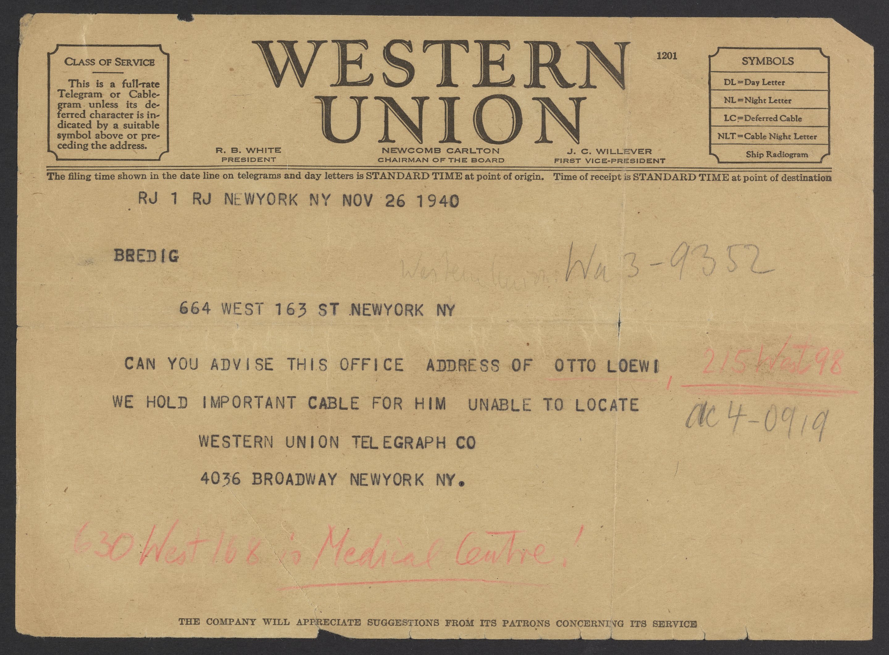 Telegram from Elisabeth Neumann to Max Bredig, November 26, 1940