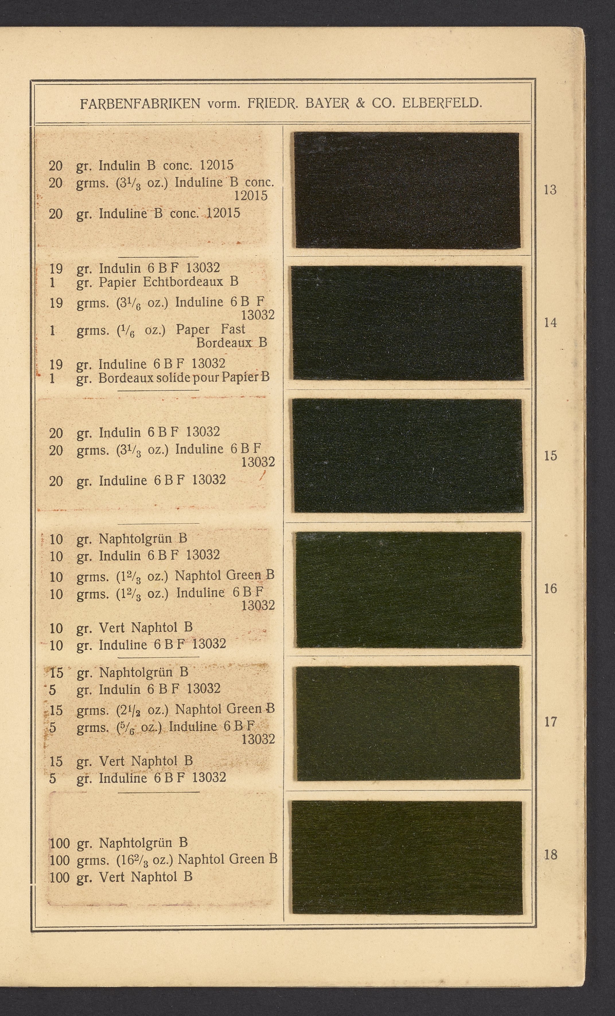 Sample book for dyeing solutions on wood from Farbenfabriken vorm. Friedrich Bayer & Co.—the first incarnation of the modern pharmaceutical company Bayer AG established to manufacture and sell synthetic dyestuffs. Contains dyeing instructions written in German, English, and French and twenty-three mounted wood samples on accordion-folded pages. Digital content includes all pages and a representative image of the full foldout.