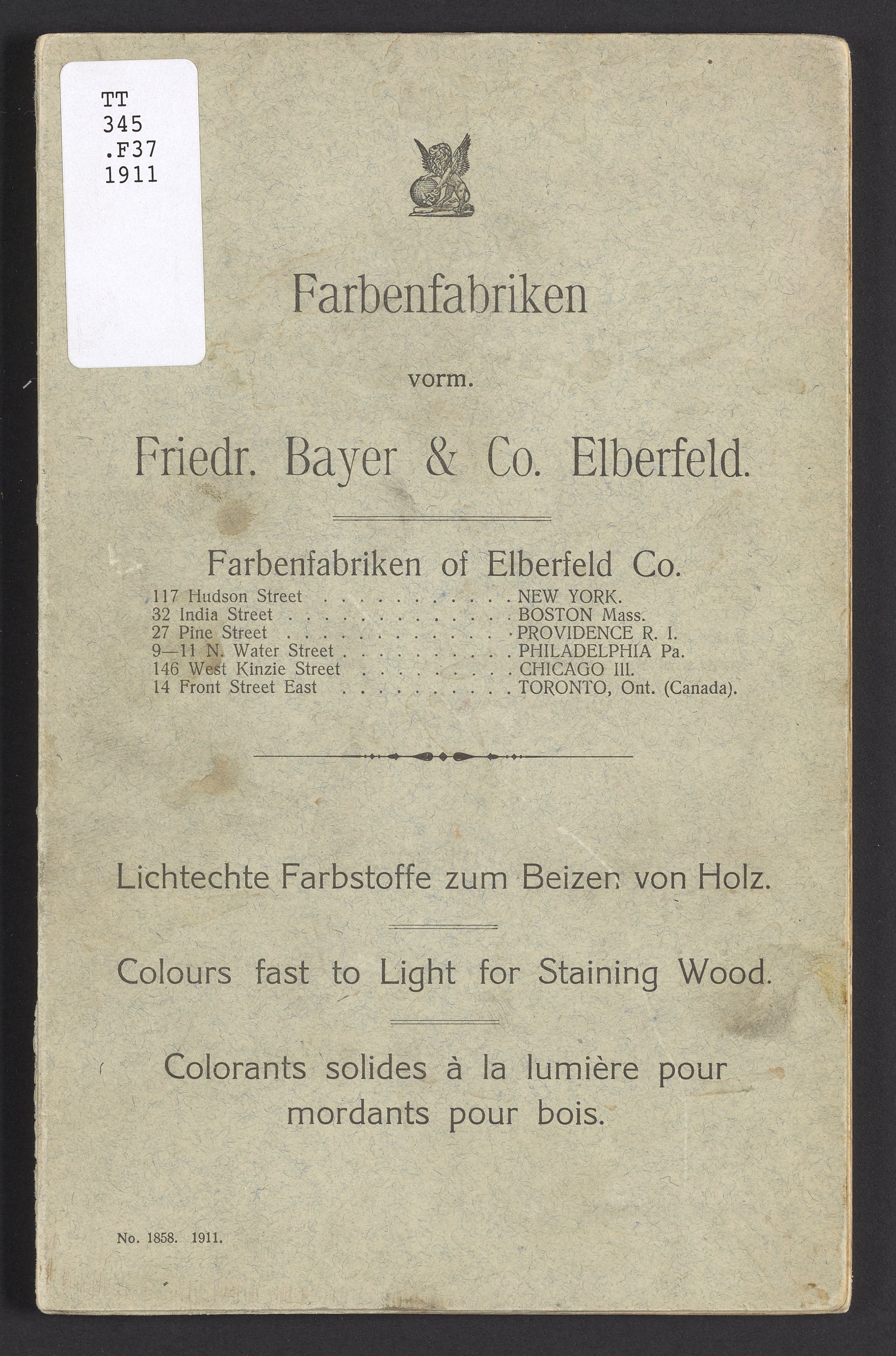 Farbenfabriken vorm. Friedrich Bayer & Co. Colours Fast to Light for Staining Wood. New York (State), 1911. https://digital.sciencehistory.org/works/q5rrjae.