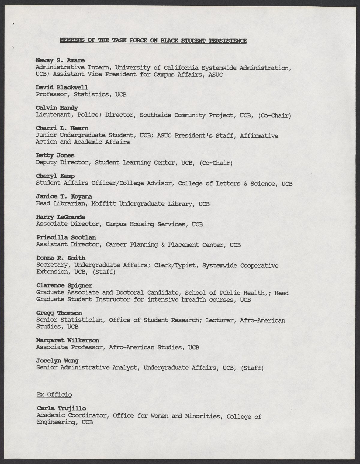 Small JPG1200 x 1543px — 166 KBLarge JPG2880 x 3704px — 1.3 MBFull-sized JPG5346 x 6876px — 5.1 MBOriginal fileTIFF — 5346 x 6876px — 105 MBA report by the University of California, Berkeley's Task Force on Black Student Persistence about Black and minority student graduation. The Task Force was co-chaired by Calvin Handy and Betty Jones. The report makes recommendations including but not limited to establishing a faculty coordinator to support Black students, and implementing policies that support minority students.