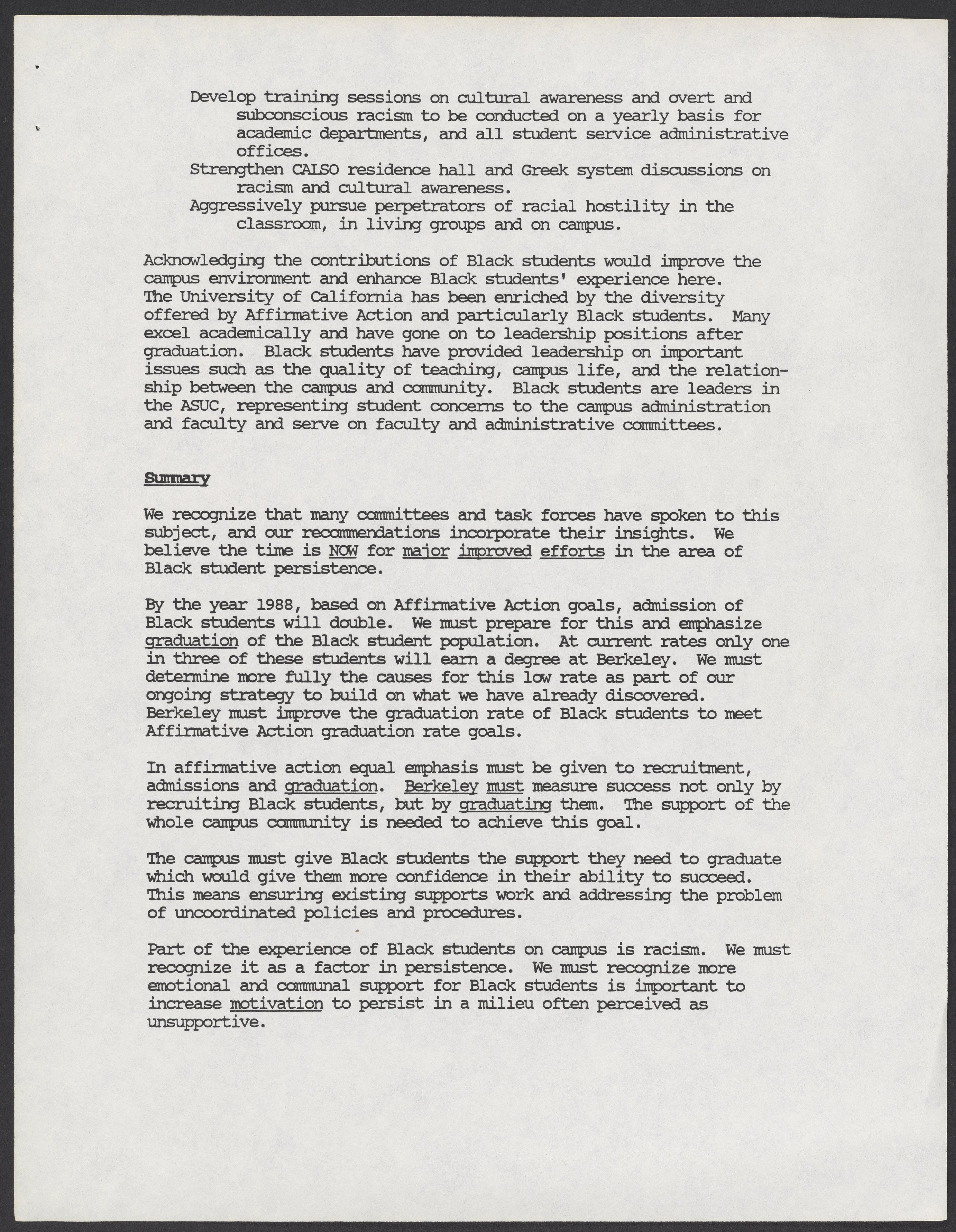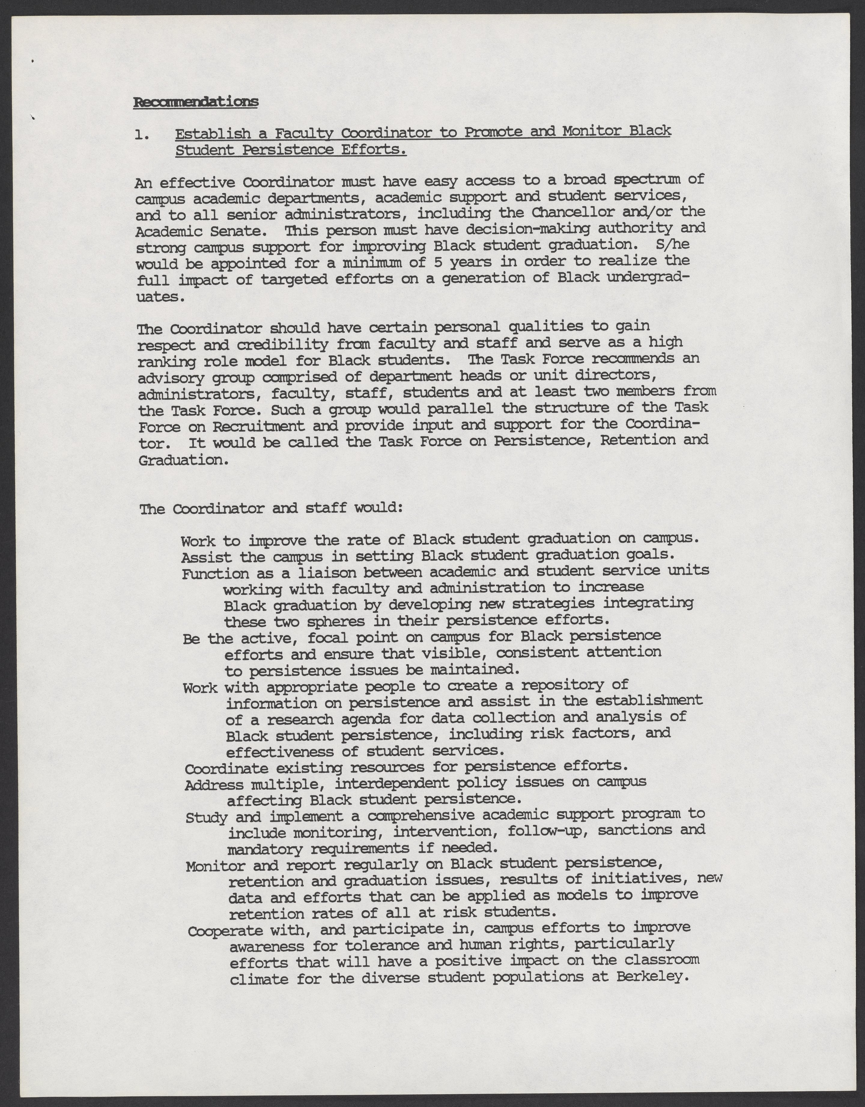 Small JPG1200 x 1543px — 166 KBLarge JPG2880 x 3704px — 1.3 MBFull-sized JPG5346 x 6876px — 5.1 MBOriginal fileTIFF — 5346 x 6876px — 105 MBA report by the University of California, Berkeley's Task Force on Black Student Persistence about Black and minority student graduation. The Task Force was co-chaired by Calvin Handy and Betty Jones. The report makes recommendations including but not limited to establishing a faculty coordinator to support Black students, and implementing policies that support minority students.