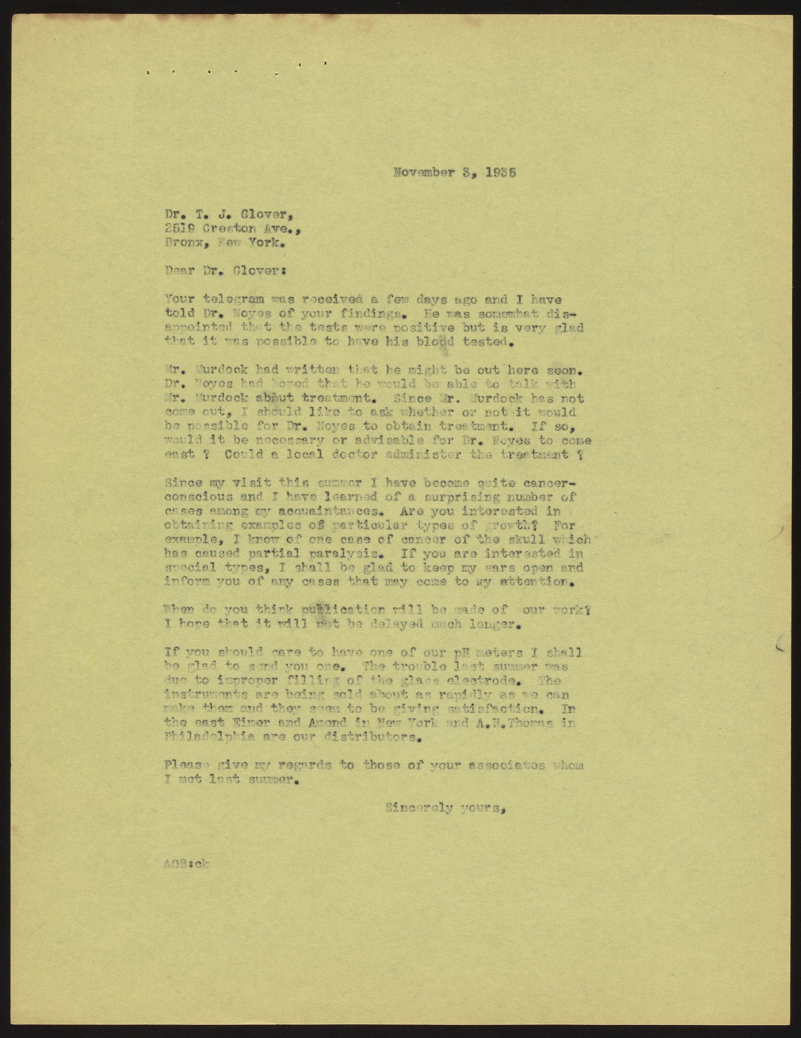 Beckman discusses cancer treatment options for his friend and colleague, Dr. Amos A. Noyes, and offers to provide Glover with a pH meter.