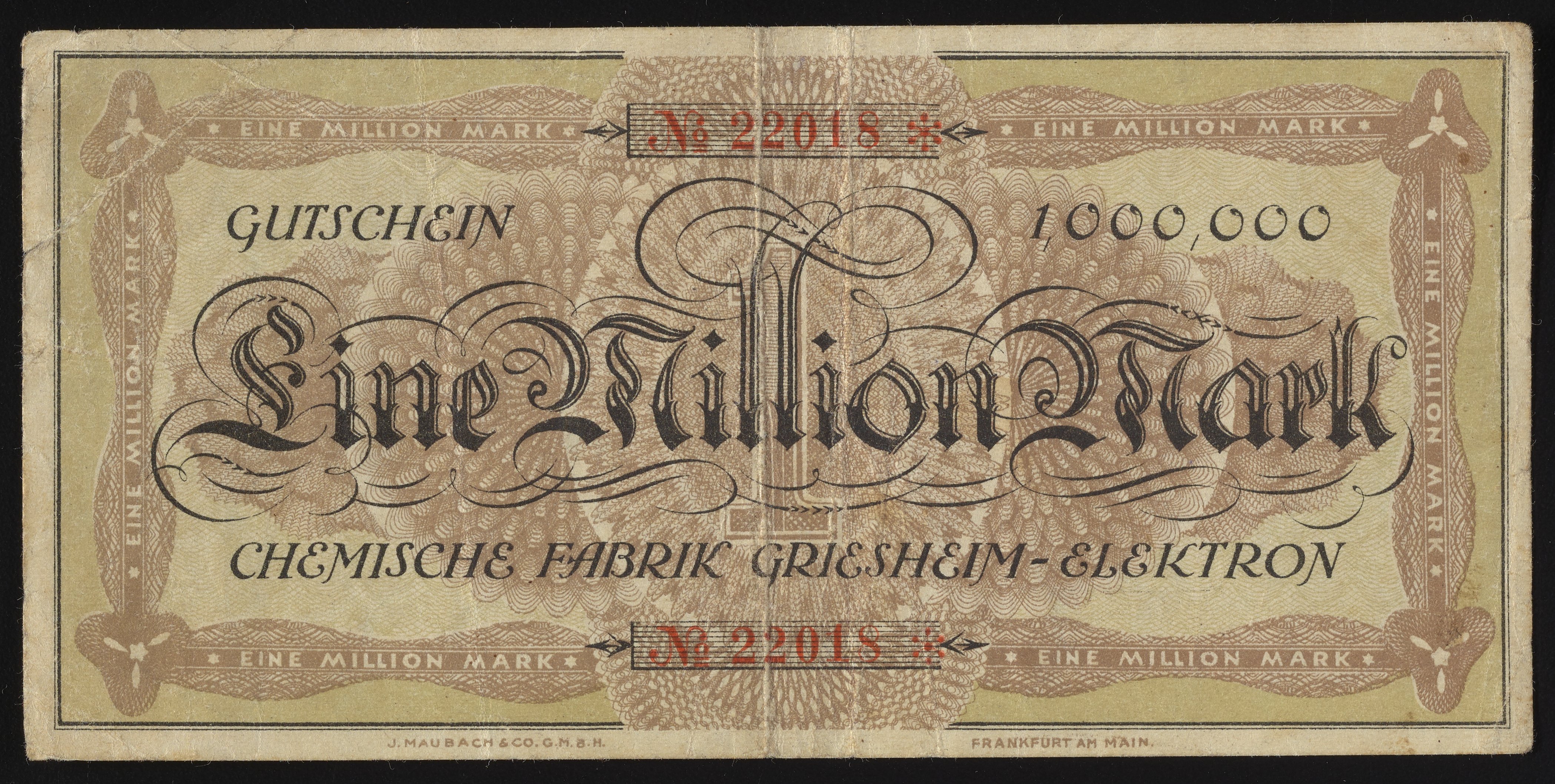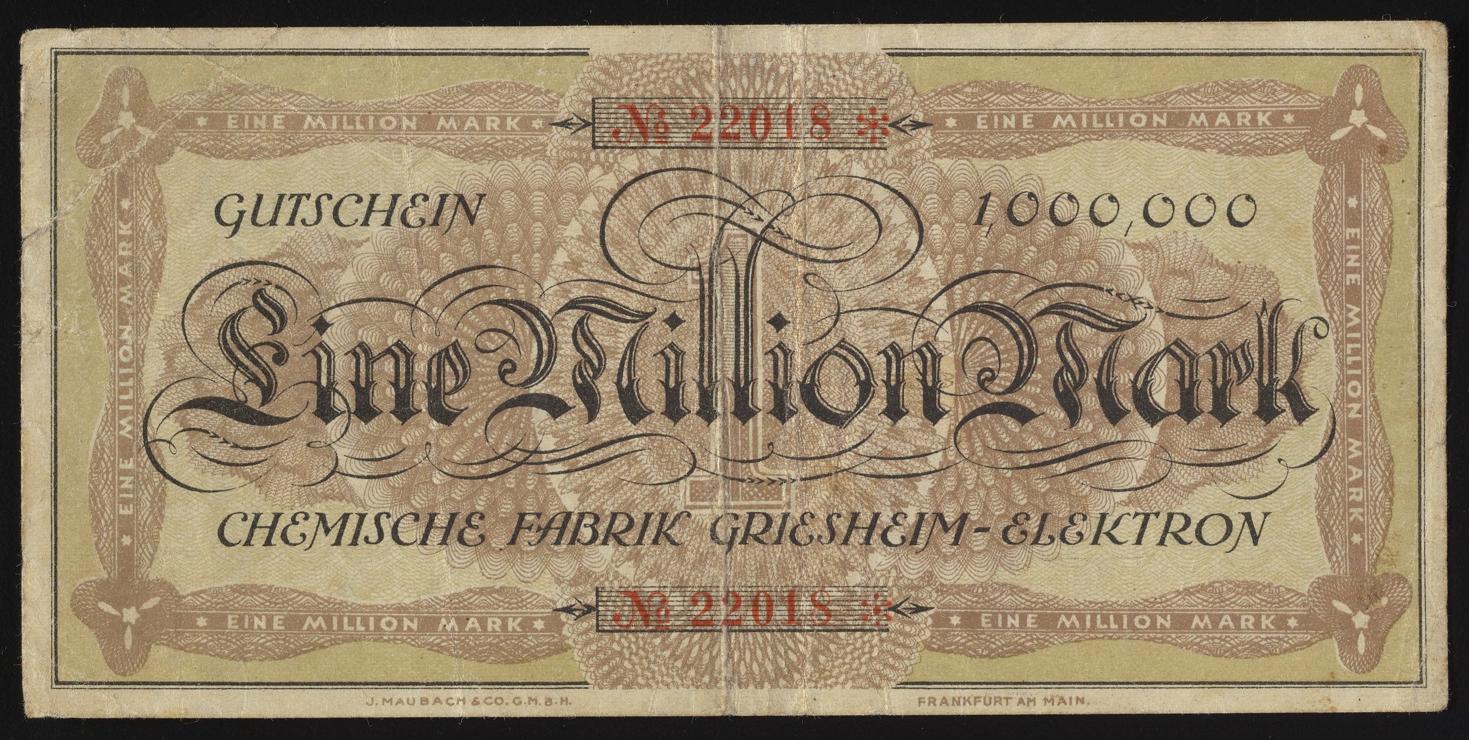 “Chemische Fabrik Griesheim-Elektron Eine Million Mark Gutschein.” Frankfurt am Main, Germany: Chemische Fabrik Griesheim Elektron, August 23, 1923. Robert J. Bauman collection. Science History Institute. Philadelphia. https://digital.sciencehistory.org/works/q811kk530.