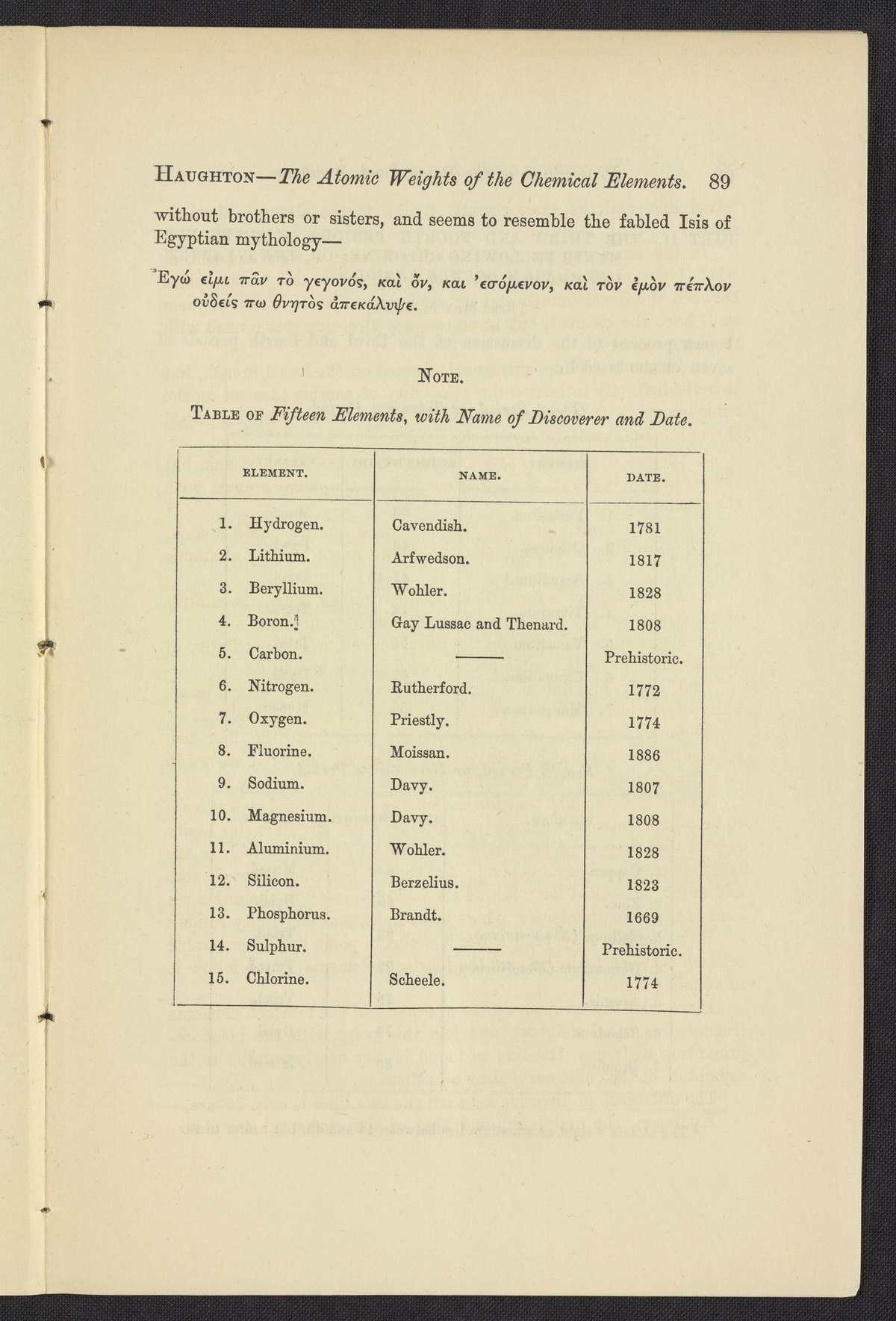 Haughton, Samuel. “Geometrical Illustrations of Newlands' and Mendelejeff's Periodic Law of the Atomic Weights of the Chemical Elements.” Dublin, Ireland, 1889. https://digital.sciencehistory.org/works/q811kk751.