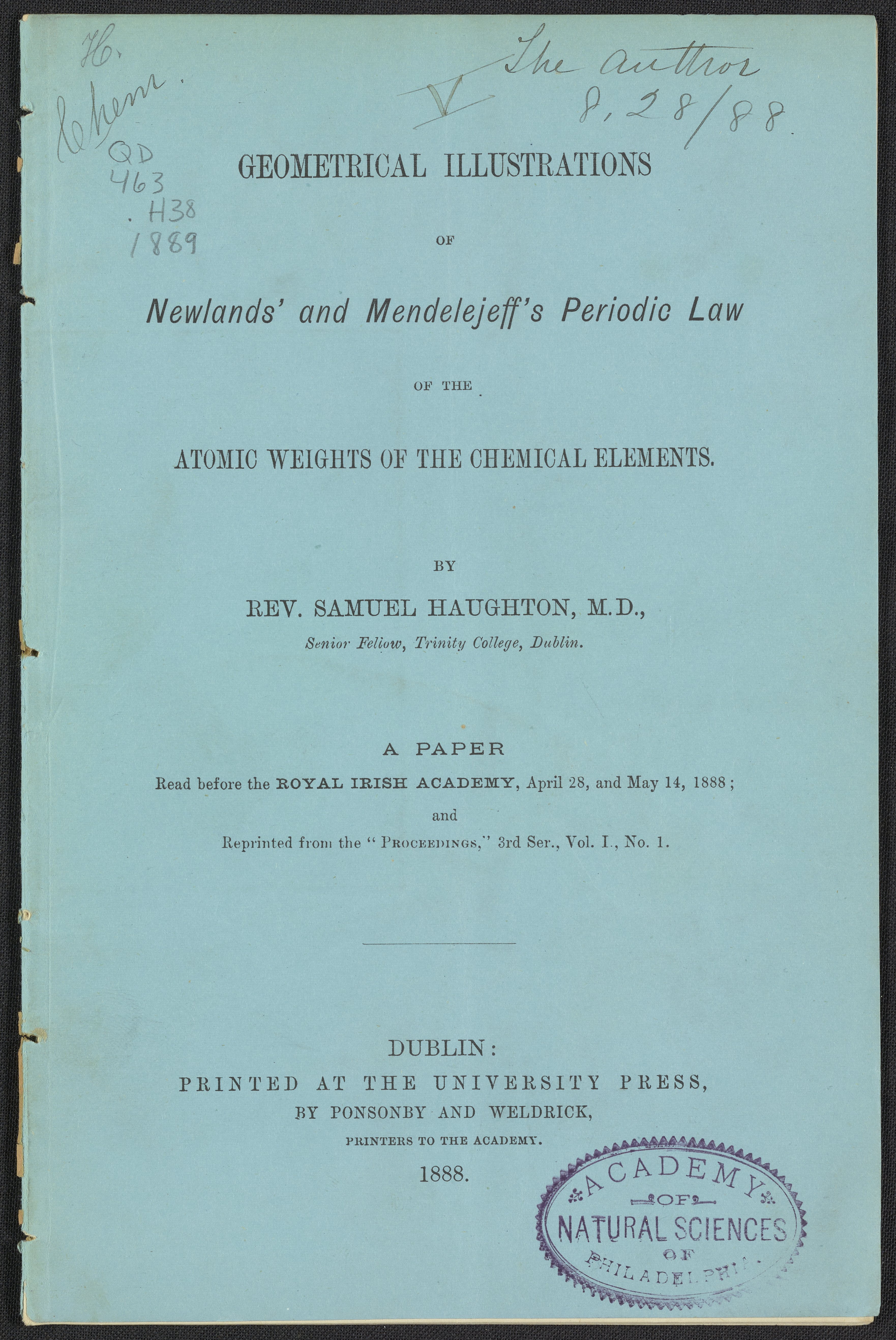 Haughton, Samuel. “Geometrical Illustrations of Newlands' and Mendelejeff's Periodic Law of the Atomic Weights of the Chemical Elements.” Dublin, Ireland, 1889. https://digital.sciencehistory.org/works/q811kk751.