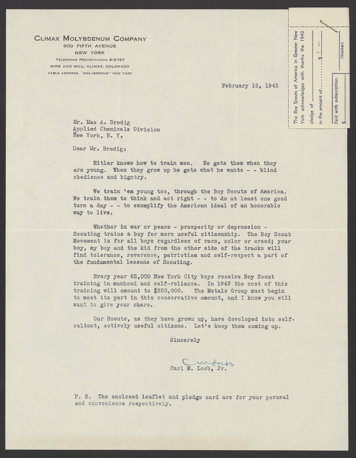 Letter requesting financial support of the Boy Scouts of America from Max Albert Bredig (1902-1977).