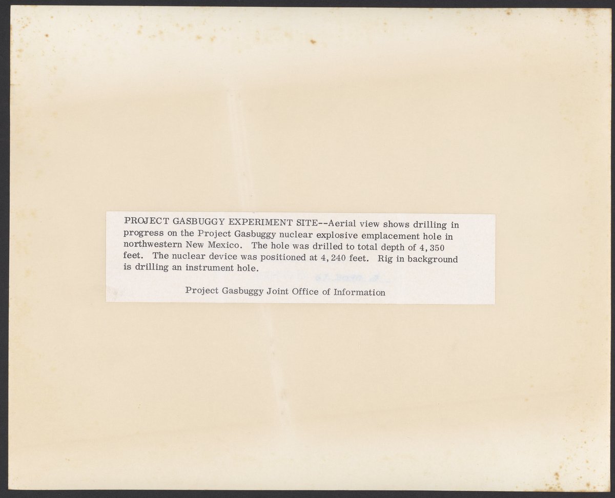 Small JPG1200 x 968px — 226 KBLarge JPG2880 x 2323px — 961 KBFull-sized JPG6237 x 5030px — 3.1 MBOriginal fileTIFF — 6237 x 5030px — 89.8 MBBlack and white photograph of the Project Gasbuggy experiment site. Aerial view shows rig and drilling in progress.