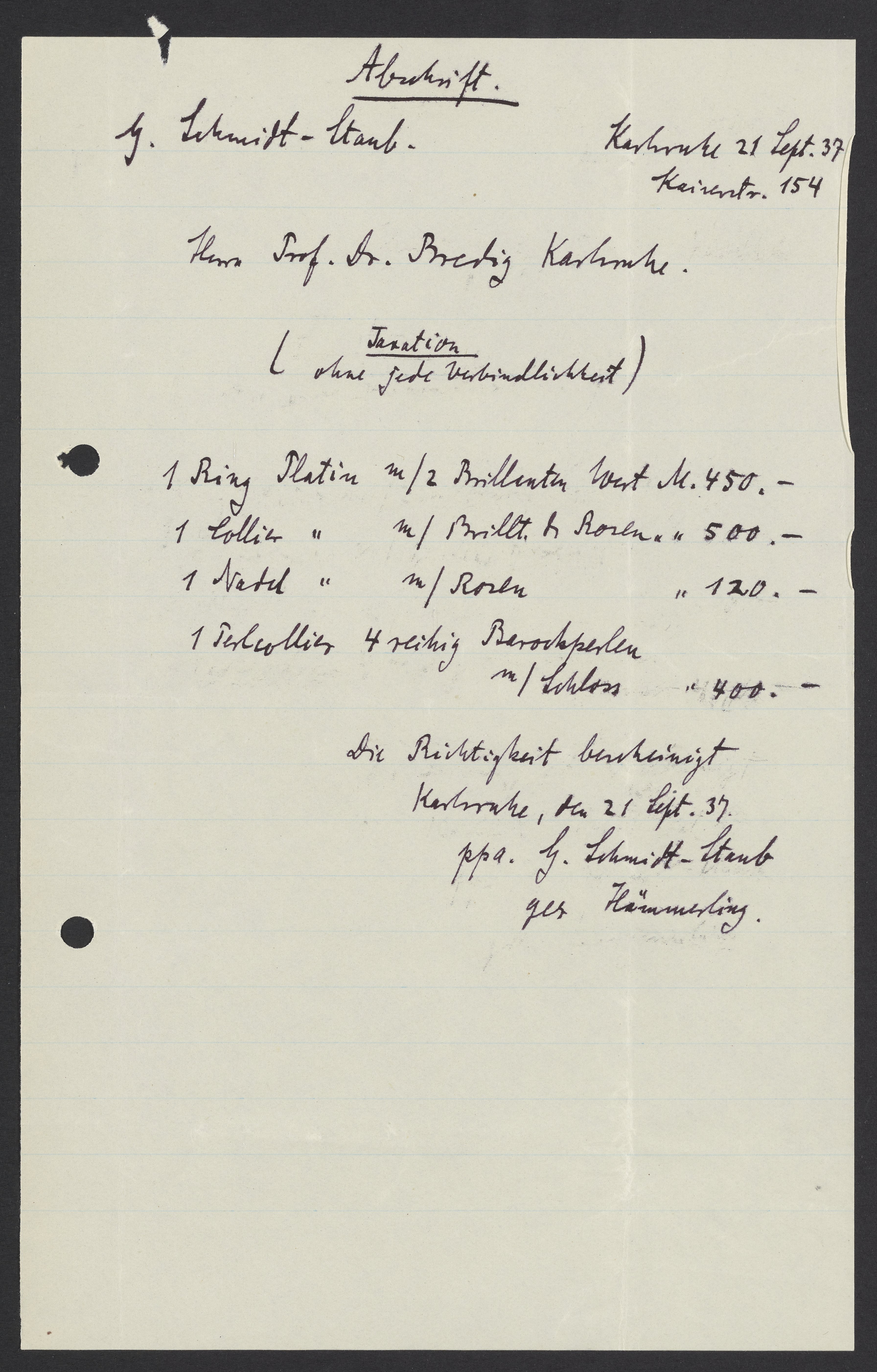 Small JPG1200 x 1860px — 269 KBLarge JPG2880 x 4465px — 1.5 MBFull-sized JPG3584 x 5556px — 2.3 MBOriginal fileTIFF — 3584 x 5556px — 57.0 MBG. Schmidt-Staub, a jeweler in Karlsruhe, informs Georg Bredig (1868-1944) of the value of four jewelry pieces that he would like to sell.