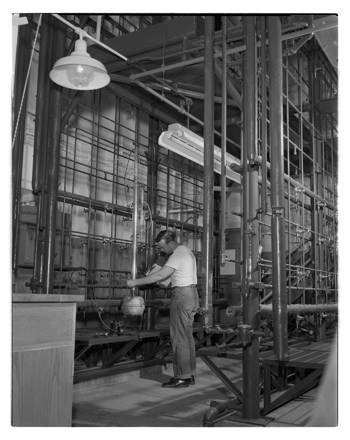 Dow Chemical Company. “Richard Bayne Testing Distillation and Miniplant Operations at Dow Plastics Production Laboratory,” June 13, 1956. Dow Chemical Company Historical Image Collection, Box 8, Folder Plants--Plastics Production Laboratory. Science History Institute. Philadelphia. https://digital.sciencehistory.org/works/qb98mg05t.