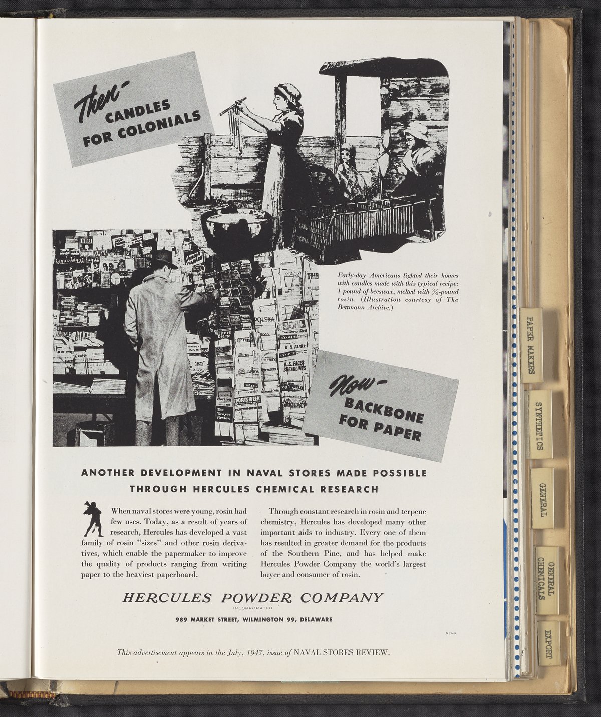 Hercules Incorporated. “Then, Candles for Colonials...Now, Backbone for Paper.” 1947 Hercules Advertisements, 1947. Records of Hercules Incorporated, Volume 1947. Science History Institute. Philadelphia. https://digital.sciencehistory.org/works/qb98mg26k.