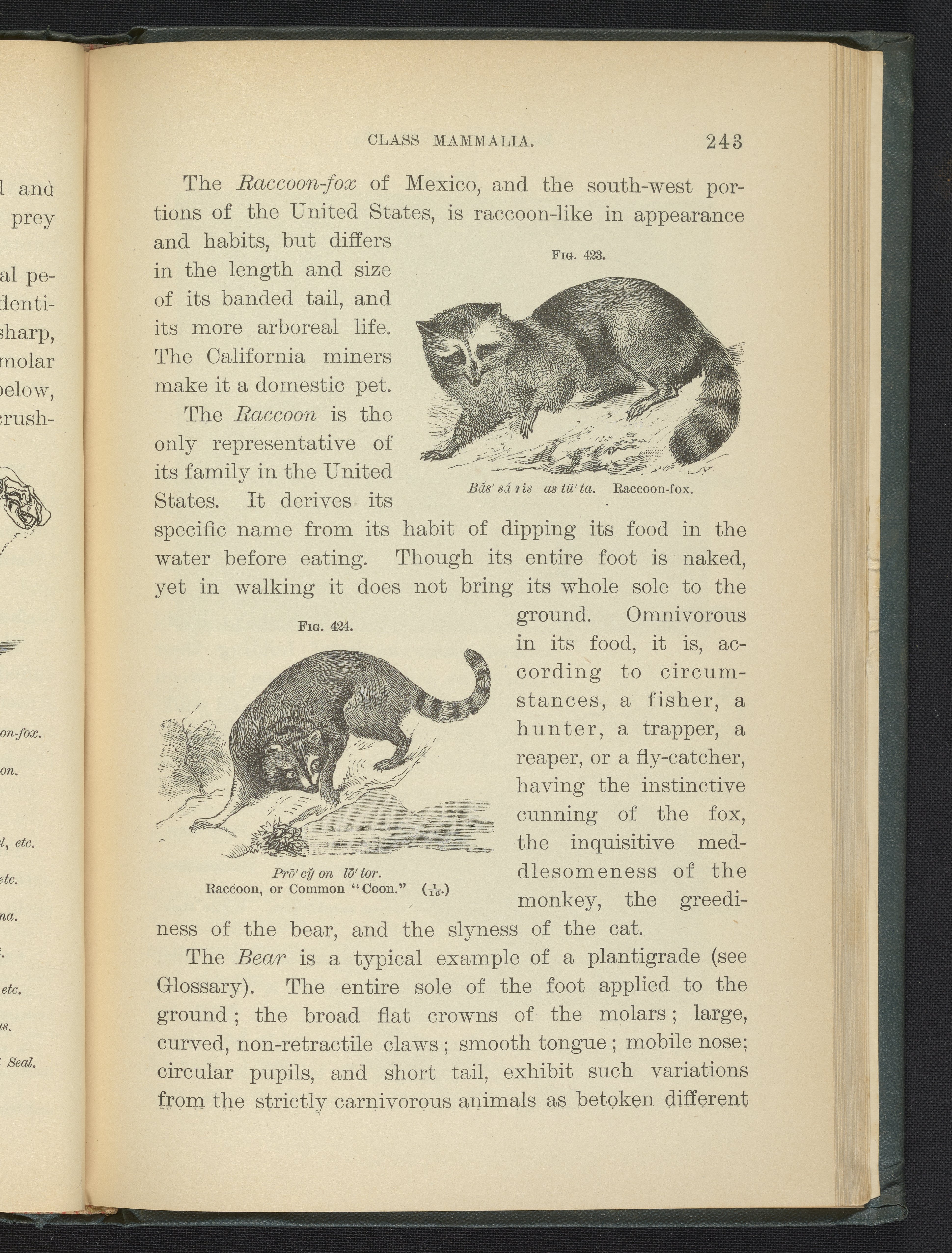 Figures 423 and 424 of the 1887 volume Popular Zoology. Figure 423 depicts a raccoon-fox. Figure 424 depicts a raccoon, or common "coon."