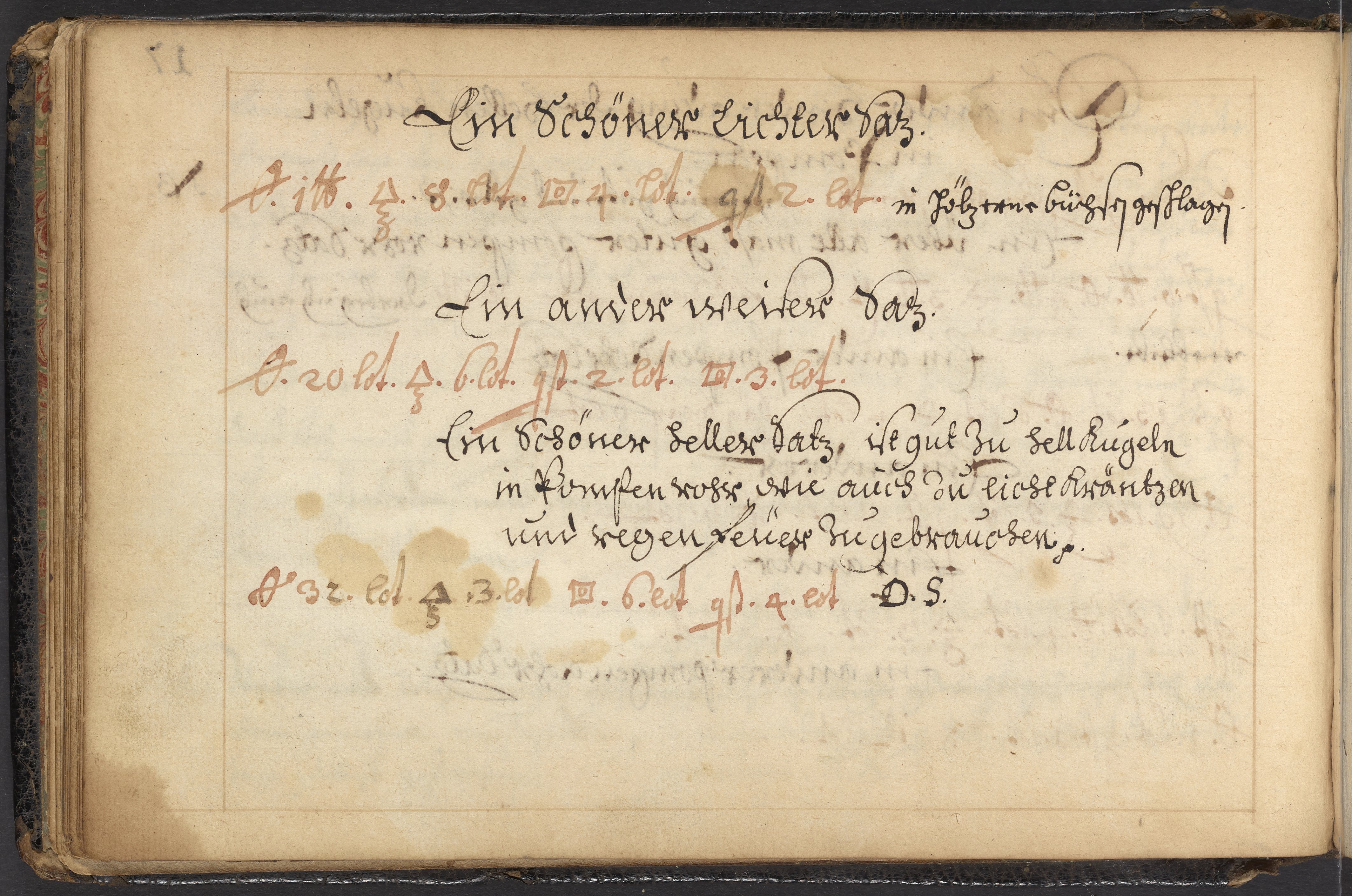 Small JPG1200 x 819px — 251 KBLarge JPG2880 x 1966px — 1.3 MBFull-sized JPG4200 x 2867px — 2.5 MBOriginal fileTIFF — 4200 x 2867px — 34.5 MBA manuscript work from Andreas Räbel, a 17th-century pyrotechnician, containing formulas and recipes for the creation of fireworks, explosives, rockets, detonators, flares, bombs, and other armament. The recipes call for ingredients ranging from metallic and metalloid elements such as antimony, tin, and mercury, to naturally occurring minerals and substances such as orpiment, chalk, coal, tree oil, and resin. The work is handwritten in German, cursive script, and includes colored ink drawings labeled with reference numbers and letters. The work also contains Räbel's description of the wedding of Emperor Leopold von Habsburg (1640-1705) to Margarita Teresa of Spain (1651-1673) on December 12, 1666. Work is digitized in its entirety.