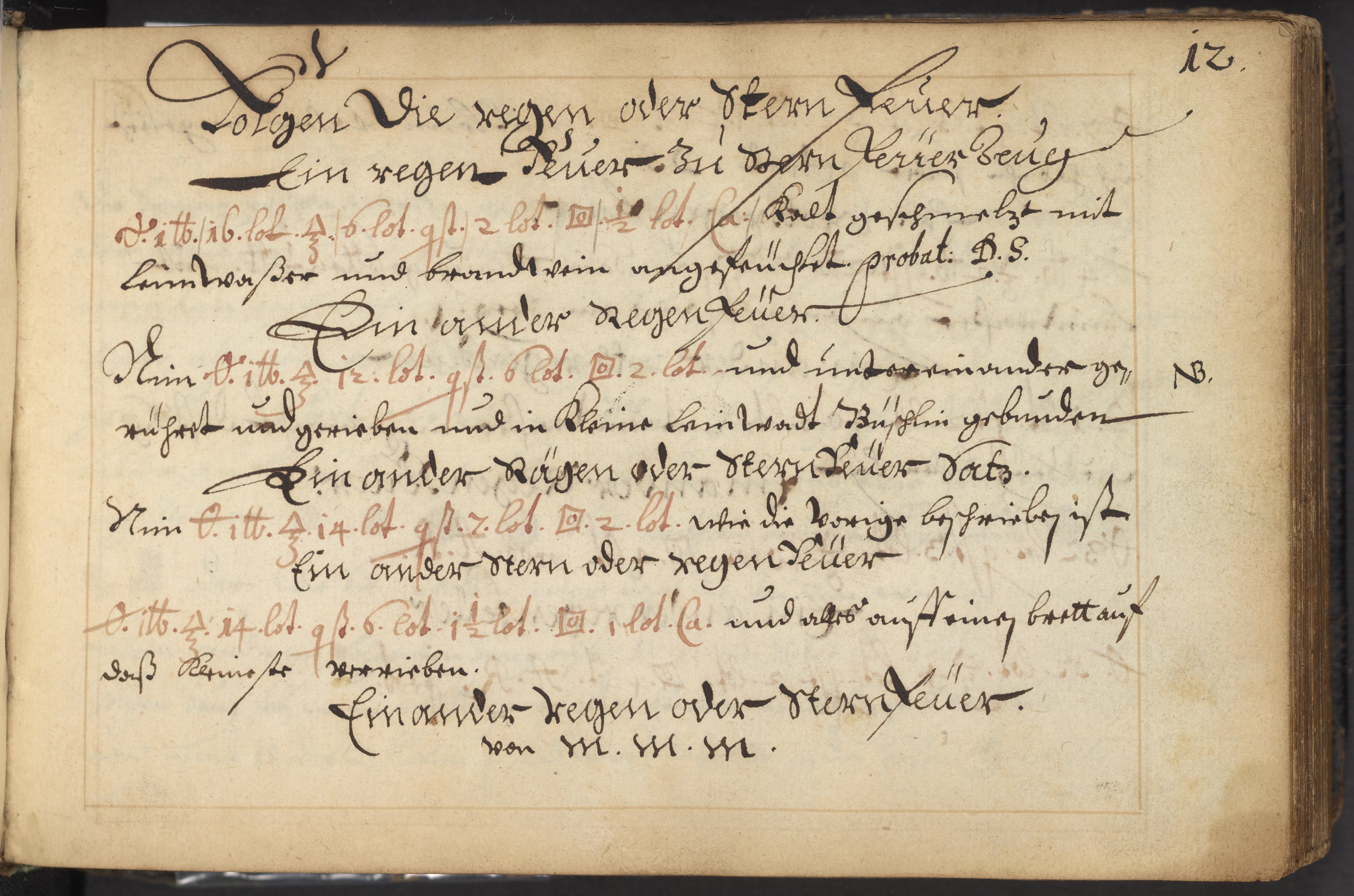 Small JPG1200 x 819px — 251 KBLarge JPG2880 x 1966px — 1.3 MBFull-sized JPG4200 x 2867px — 2.5 MBOriginal fileTIFF — 4200 x 2867px — 34.5 MBA manuscript work from Andreas Räbel, a 17th-century pyrotechnician, containing formulas and recipes for the creation of fireworks, explosives, rockets, detonators, flares, bombs, and other armament. The recipes call for ingredients ranging from metallic and metalloid elements such as antimony, tin, and mercury, to naturally occurring minerals and substances such as orpiment, chalk, coal, tree oil, and resin. The work is handwritten in German, cursive script, and includes colored ink drawings labeled with reference numbers and letters. The work also contains Räbel's description of the wedding of Emperor Leopold von Habsburg (1640-1705) to Margarita Teresa of Spain (1651-1673) on December 12, 1666. Work is digitized in its entirety.