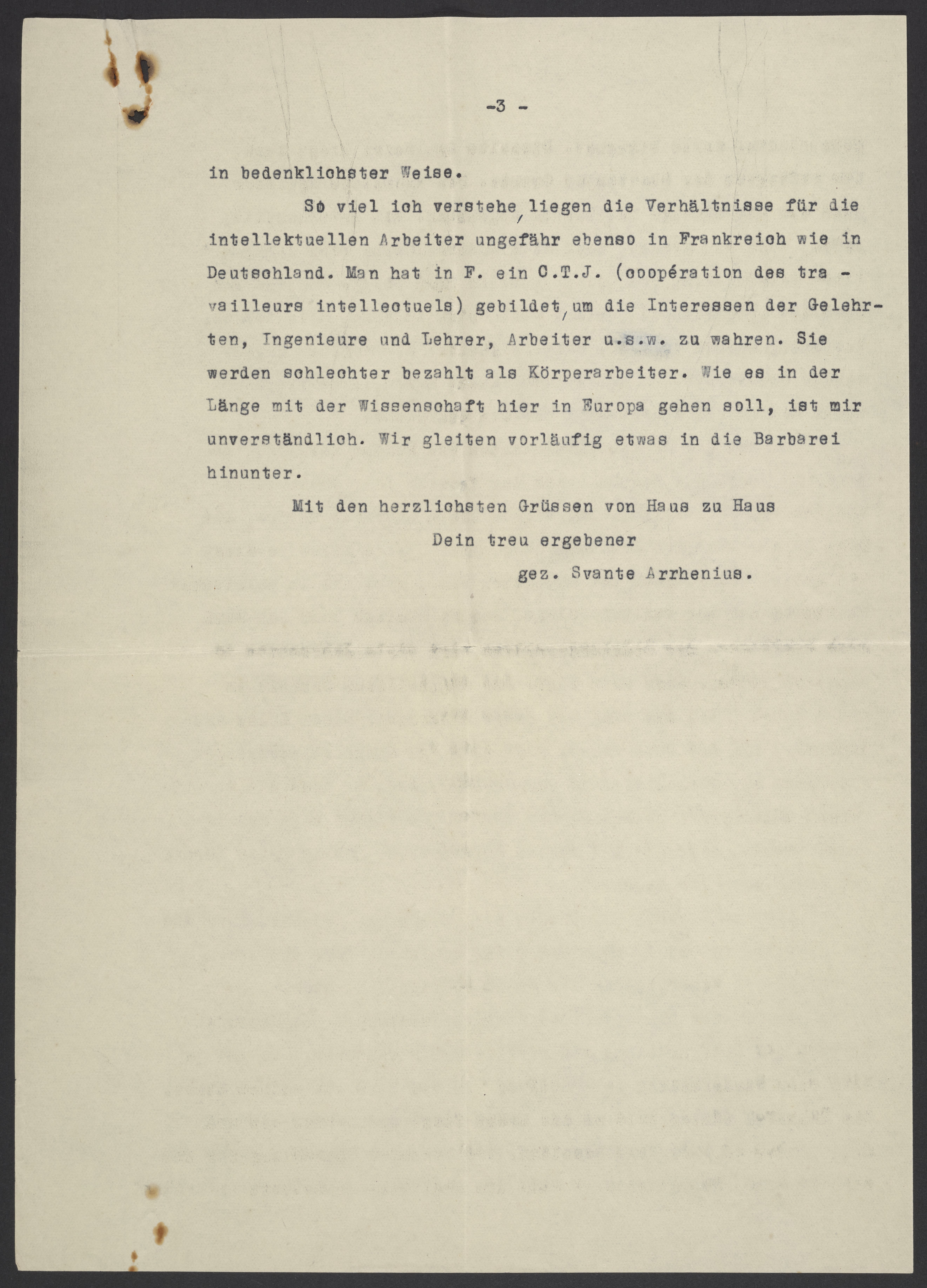 So viel ich verstehe, liegen die Verhältnisse für die intellektuellen Arbeiter ungefähr ebenso in Frankreich wie in Deutschland. Man hat in F. ein C.T.J (coopération des travailleurs intellectuels) gebildet, um die Interessen der Gelehrten, Ingenieure und Lehrer, Arbeiter u.s.w zu wahren. Sie werden schlechter bezahlt als Körperarbeiter. Wie es in der Länge mit der Wissenschaft hier in Europa gehen soll, ist mir unverständlich. Wir gleiten vorläufig etwas in die Barbarei hinunter.