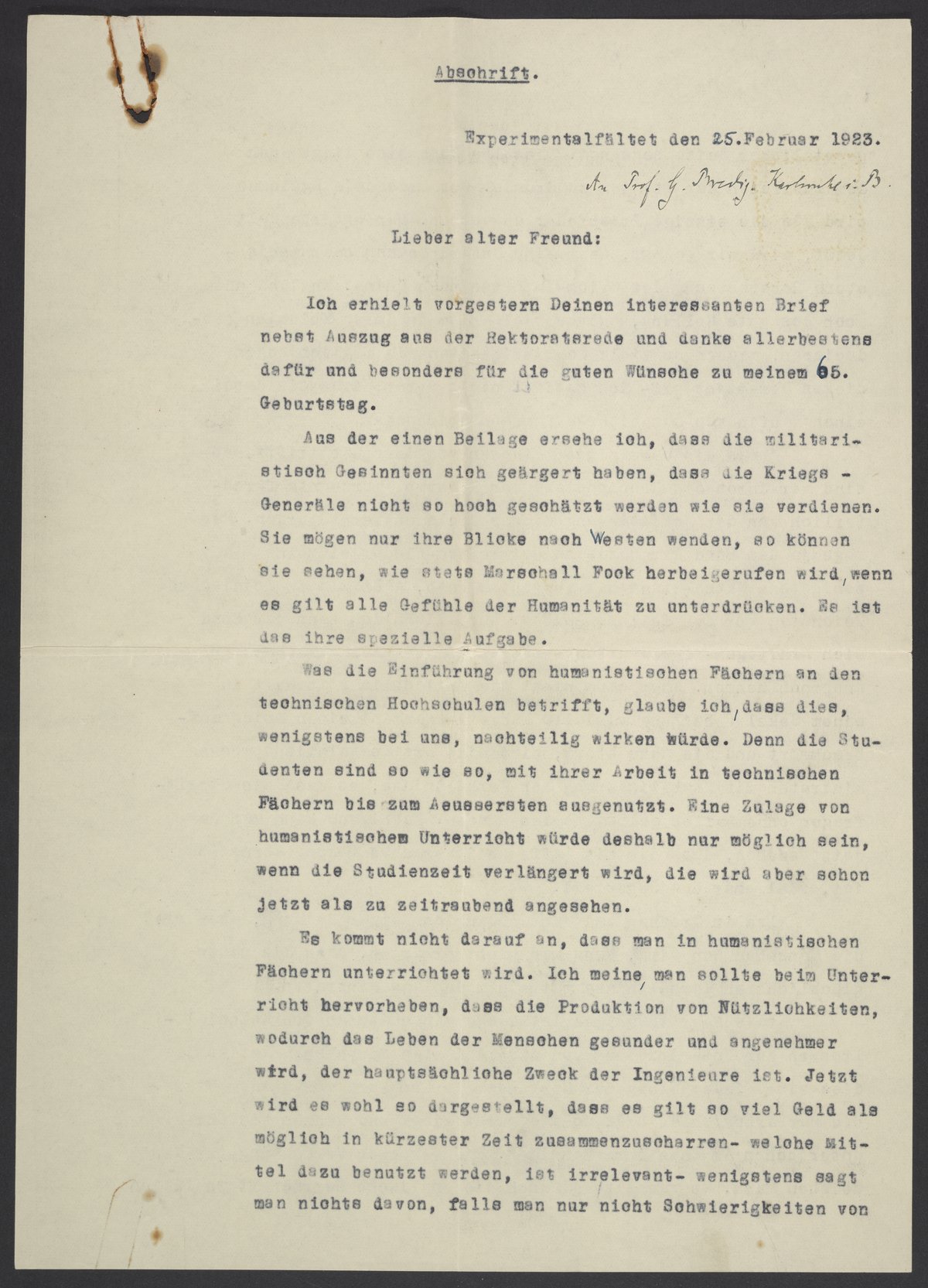 Ich erhielt vorgestern Deinen interessanten Brief nebst Auszug aus der Rektoratsrede und danke allerbestens dafür und besonders für die guten Wünsche zu meinem 65. Geburtstag.